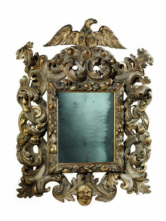 Cornice, Italia centrale, inizi sec. XVIII, in legno riccamente intagliato a cartocci di foglie di acanto, dipinto bianco e in parte dorato, cimasa sormontata da aquila ad ali spiegate, tre grandi volute ricadenti in basso, parte inferiore centrata da mascherone, cornice interna rettangolare a serto intrecciato di foglie e frutti, luce cm 39x32, piccoli danni e restauri
