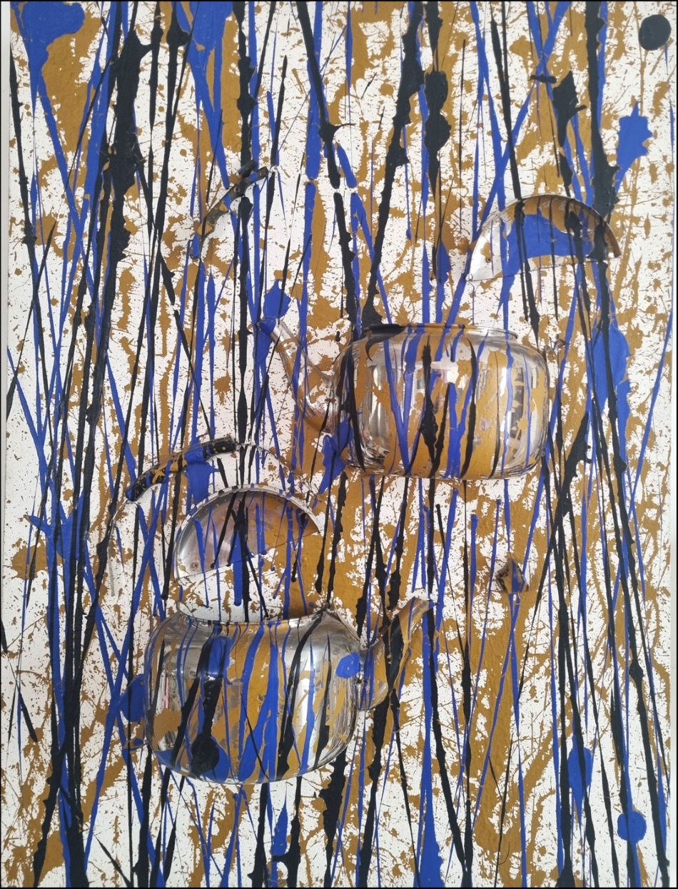 FERNANDEZ ARMAN Nizza 1928 - New York 2005 "Senza titolo" Teiere tagliate montate su tela applicata su tavola, con pittura acrilica nero, blu oltremare chiaro e tabacco chiaro, cm 60,5x81x4, del 2001. Certificato di autenticità su foto a cura di Dante Vecchiato Gallery.