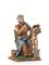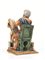 in maiolica decorata in policromia con giallo, azzurro, verde bruno di manganese, bianco di stagno. Il calamaio raffigura San Matteo che scrive il Vangelo, seduto su una sedia dall’alto schienale, il volume sorretto sulla schiena da un piccolo angioletto in piedi su un pilastro quadrangolare; ai piedi del santo un vasetto decorato da mascheroni e un libro chiuso. San Matteo tiene il libro con la mano sinistra e, portando al petto la destra, guarda avanti con atteggiamento ispirato. Queste plastiche avevano una destinazione privata, frutto di commissione o di dono, prodotte utilizzando figure modellate, ma talvolta con dettagli tratti a stampo, che consentivano di moltiplicare i soggetti modificandone il carattere simbolico–decorativo specialmente nelle opere con più personaggi. Carmen Ravanelli Guidotti ha attribuito questa tipologia alla bottega Patanazzi datandola, come già notato dal Ballardini (G. Ballardini, Il calamaio di un grandissimo storico, in Faenza XXXVI, fasc. V, 1950, pp 99-103) in base ad un esemplare con stemma Aldobrandini, alla fine del Cinquecento e ai primi anni del Seicento. La studiosa supera l’attribuzione a Faenza proponendo la paternità urbinate in virtù delle caratteristiche tecniche: il modellato un poco goffo, il notevole spessore dello smalto, l’associazione – non in questo caso - con raffaellesche, ed altro ancora. Questo calamaio presenta una bordura realizzata con un motivo ad archetti spesso presente nelle decorazioni minori delle opere dei Patanazzi, cm. 30x16x17