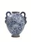 in maiolica decorata in monocromia berettina a foglie di quercia partite sul davanti da cartiglio con iscrizione S ROSATI SOLU sovrastante una mandorla ovale entro cui è raffigurato in stile compendiario San Rocco che indica la ferita; sul retro cartiglio con data 1591; Anse con manici a serpentine e mascheroni.