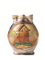 in maiolica decorata in policromia con verde, arancio, giallo e blu, corpo ovoidale poggiante su piede largo e piano appena svasato e con orlo arrotondato. La bocca è trilobata e il manico, a nastro robusto, si diparte appena sotto l’orlo per scendere fino alla pancia del contenitore. La foggiatura è al tornio; lo smalto bianco ricopre l’intera superficie nella zona anteriore del ventre e una fascia all’interno. Sul fronte, entro una corniciatura circolare con motivo decorativo “a scaletta”, è schizzato un paesaggio che vede protagonista una casa dal tetto spiovente, realizzata con colori caldi, in un prato erboso in verde ramina cupo. La restante superficie, ad esclusione del manico, è decorata da una larga fascia ornata da tratti obliqui e paralleli in blu cobalto che vanno a formare una densa quadrettatura a maglia larga e fina. Due linee parallele ornano il collo, alt. cm 19,7, diam. cm 9,5