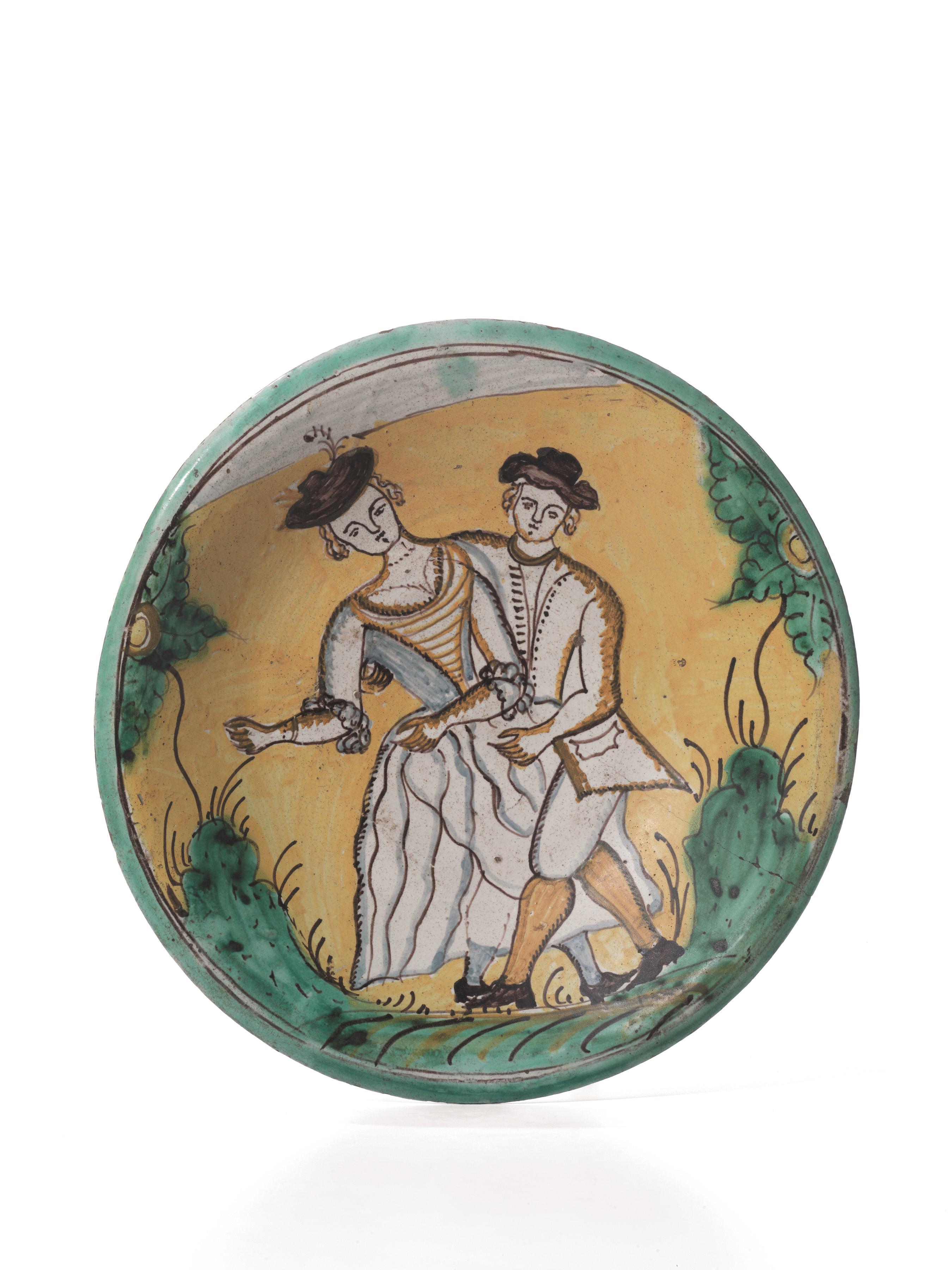 Maiolica decorata in giallo, giallo arancio, manganese nei toni del marrone e del nero, verde azzurro, forma svasata con orlo arrotondato poggiante su un piede appena rilevato. Il centro del cavetto è abitato da una coppia di giovani circondati da elementi vegetali stilizzati. Si tratta di una tipica scenetta di genere che riscontra un certo successo nelle raffigurazioni delle botteghe montelupine, alt. cm 6, diam. cm 31