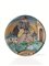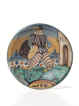 in maiolica decorata in giallo, giallo arancio, manganese nei toni del marrone e del nero, verde azzurro, forma svasata con orlo arrotondato poggiante su un piede appena rilevato. Al centro del cavetto la figura di un tamburino, vestito con il consueto abito dai larghi pantaloni, che avanza con il tamburo sotto il braccio destro. Il paesaggio è caratterizzato dai consueti elementi decorativi circolari e mostra, sulla destra, un edificio, alt. cm 6, diam. cm 33,5