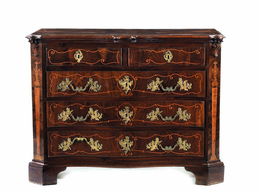 Cassettone, Roma, sec. XVIII, in radica di noce intarsiata in bosso, piano sagomato con becco do civetta, fronte a doppia mossa con due cassetti appaiati e tre sottostanti decorati da riserve intarsiate mistilinee, angoli scantonati decorati ad intarsio da pilastri rastremati che sorreggono vasi, base modanata, piedi a mensola, cm 130x61x98, piccoli restauri