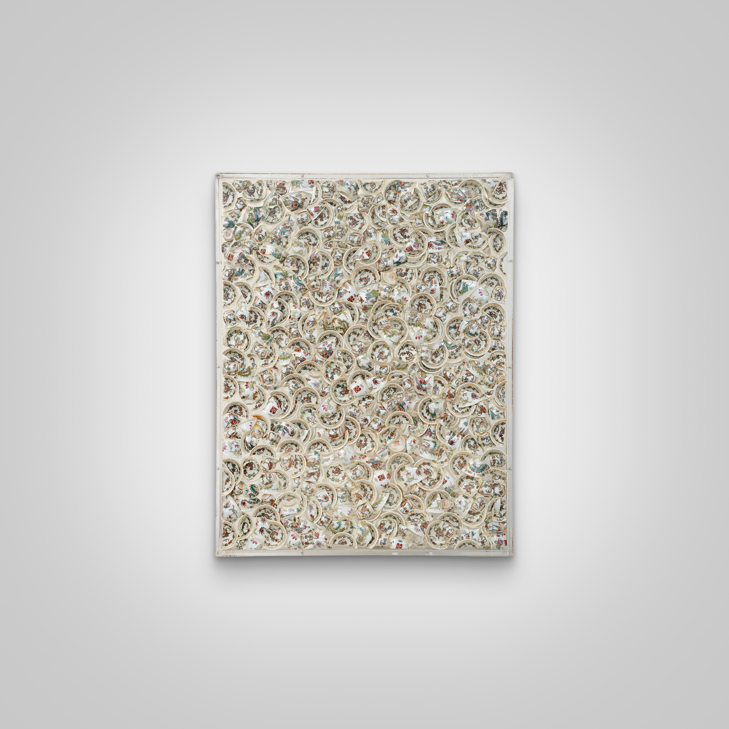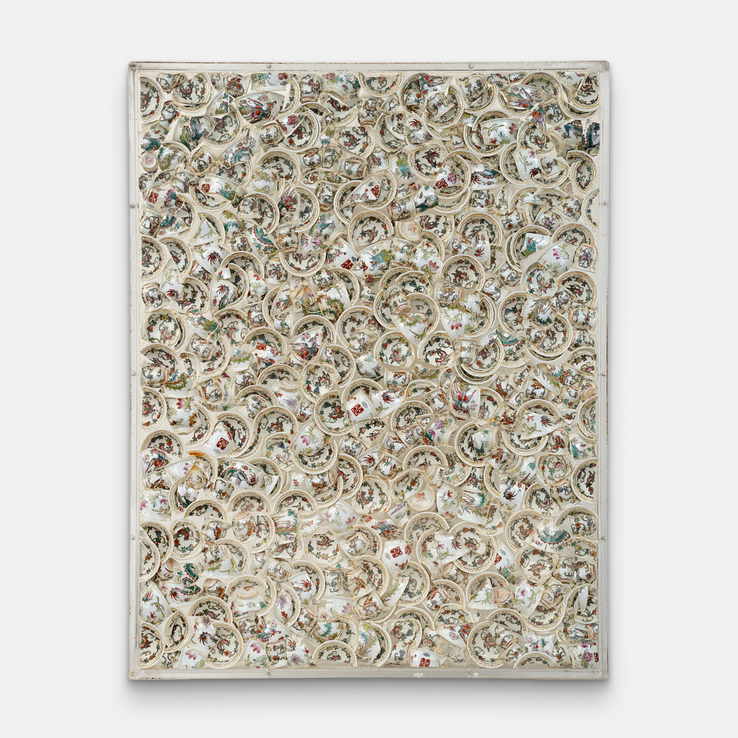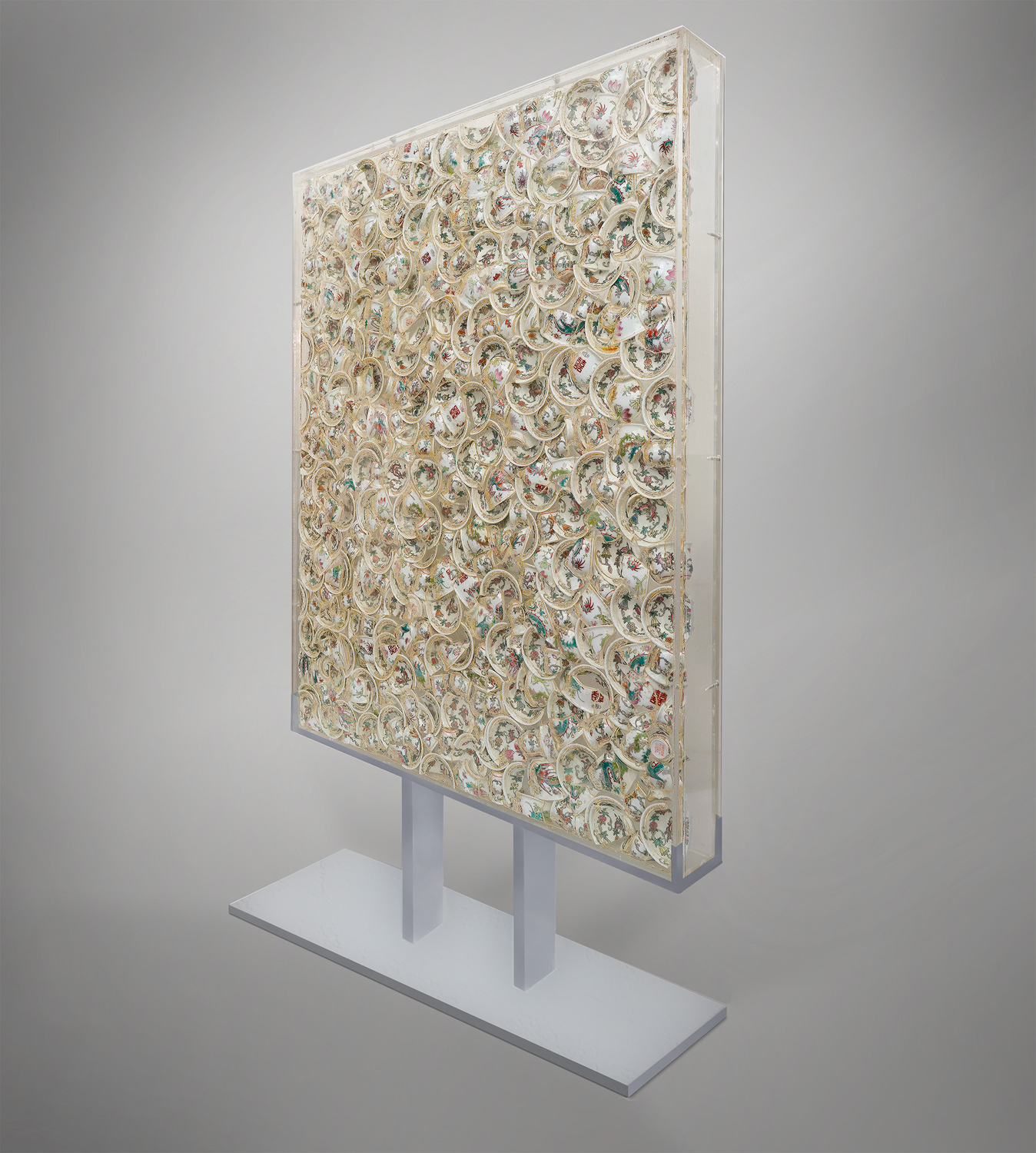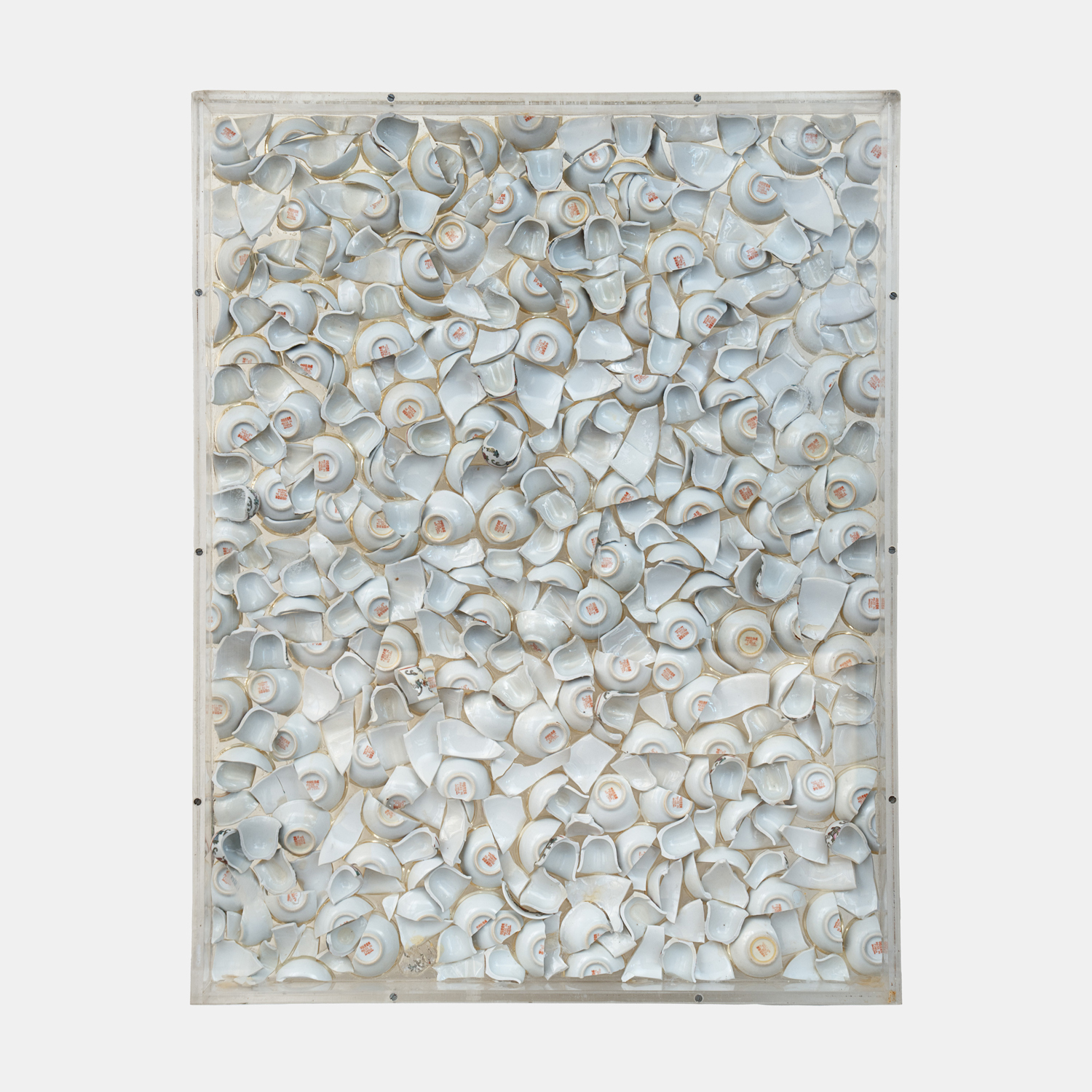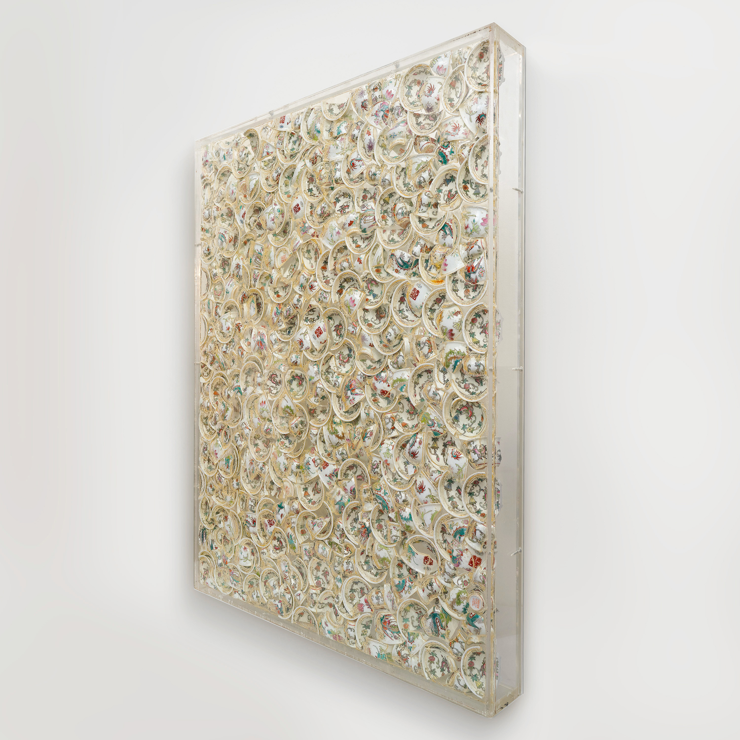 Accumulazione di piatti di porcellana cinese rotti inclusi nel plexiglass