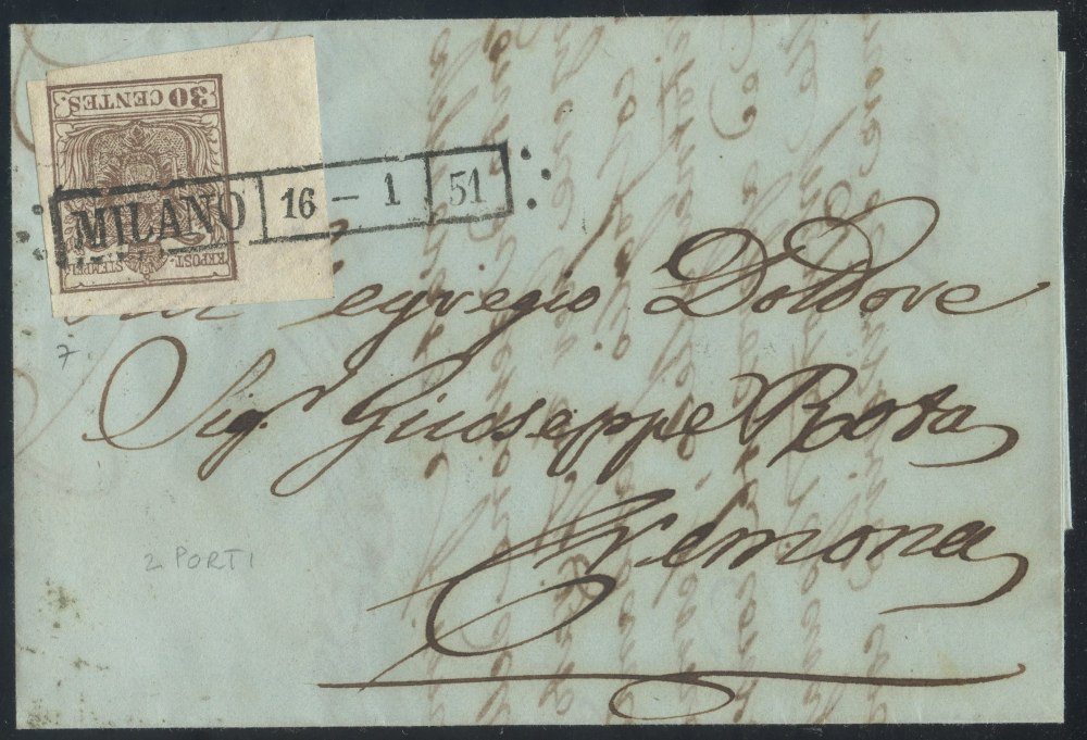 1851 - 30 cent. I tipo n.7 con ampio bordo di foglio a sinistra su lettera da Milano per Cremona. (LUX)