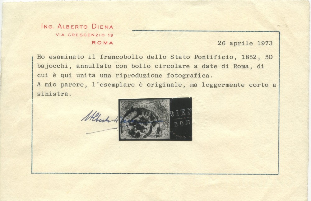 1852 - 50 baj azzurro annullato tramite il DC in azzurro di Roma. Rasente nel margine sinistro, non comune. Cat. 5.500. (A-) (Cert. Alberto Diena, Cert. Bolaffi)
