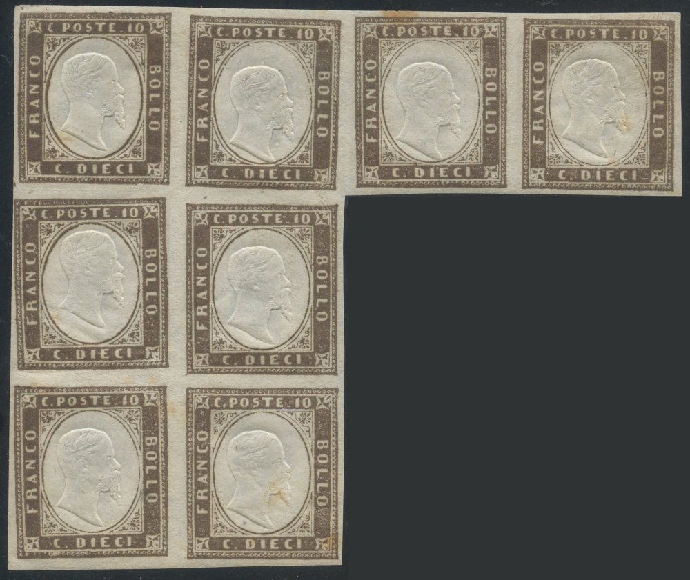 1858 - 10 cent. bruno giallastro n. 14Aa in blocco di 8 nuovo con gomma integra. Tutti i valori presentano la varietà ''Orecchio grande'' descritta dal Rattone e da chiavarello nel suo studio sulle effigi usate dal Matraire. Raro insieme (A+/A)