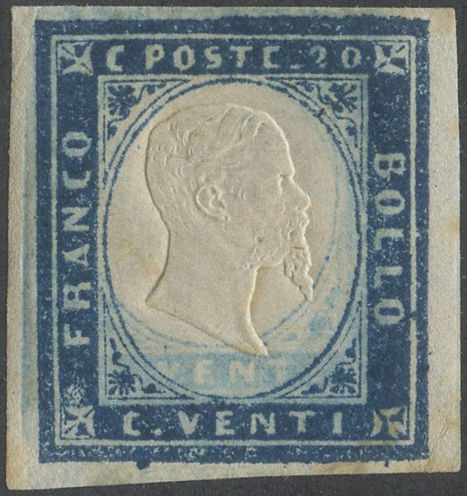 1859 - 20 cent. azzurro scuro n.15B nuovo con gomma, linguellato. Splendido esemplare con stampa parassita completa. Cat. 4.000++. (A+) (Chiavarello)