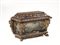 in legno intagliato, laccato, dipinto e dorato a mecca. Corpo di forma trapezoidale arricchito sul fronte da veduta marina e sui fianchi da scene bucoliche dipinte ad olio ed inserite in riserve sagomate. Angoli impreziositi da puntini alati a rilievo, piedi anteriori a zampa ferina, coperchio ad urna decorato con fregi vegetali, cm 25,5x42x20