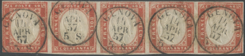 1855 - 40 cent. vermiglio scuro n.16b in striscia di 5. A causa dell'abituale tosatura dei margini del foglio e del difficoltoso taglio manuale, sono molto rare le strisce di 5 aventi tutti i francobolli perfetti. Cat. 13.300++. (A+) (Cert. Bottacchi, Enzo Diena, Chiavarello per esteso).