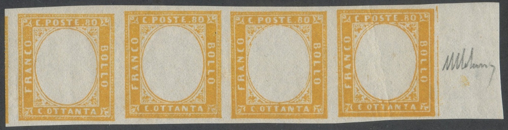 Sardegna - IV emissione, 80 cent. striscia di 4 senza effige e con esemplare con filetto nel margine.