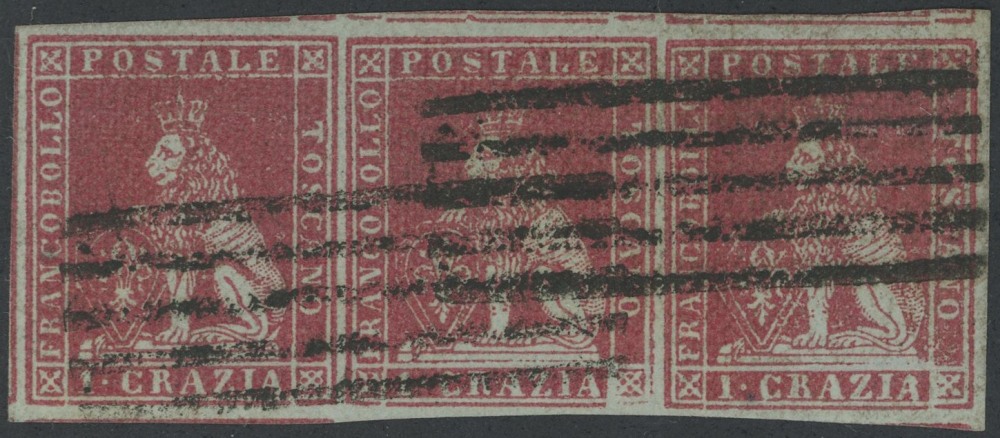 1851 - 1 crazia carminio chiaro su grigio n. 4 in striscia di tre, usata. La straordinaria qualità e i numerosi e vistosi DC rendono questo oggetto di grande interesse. Cat. 1.400 euro. (LUX)