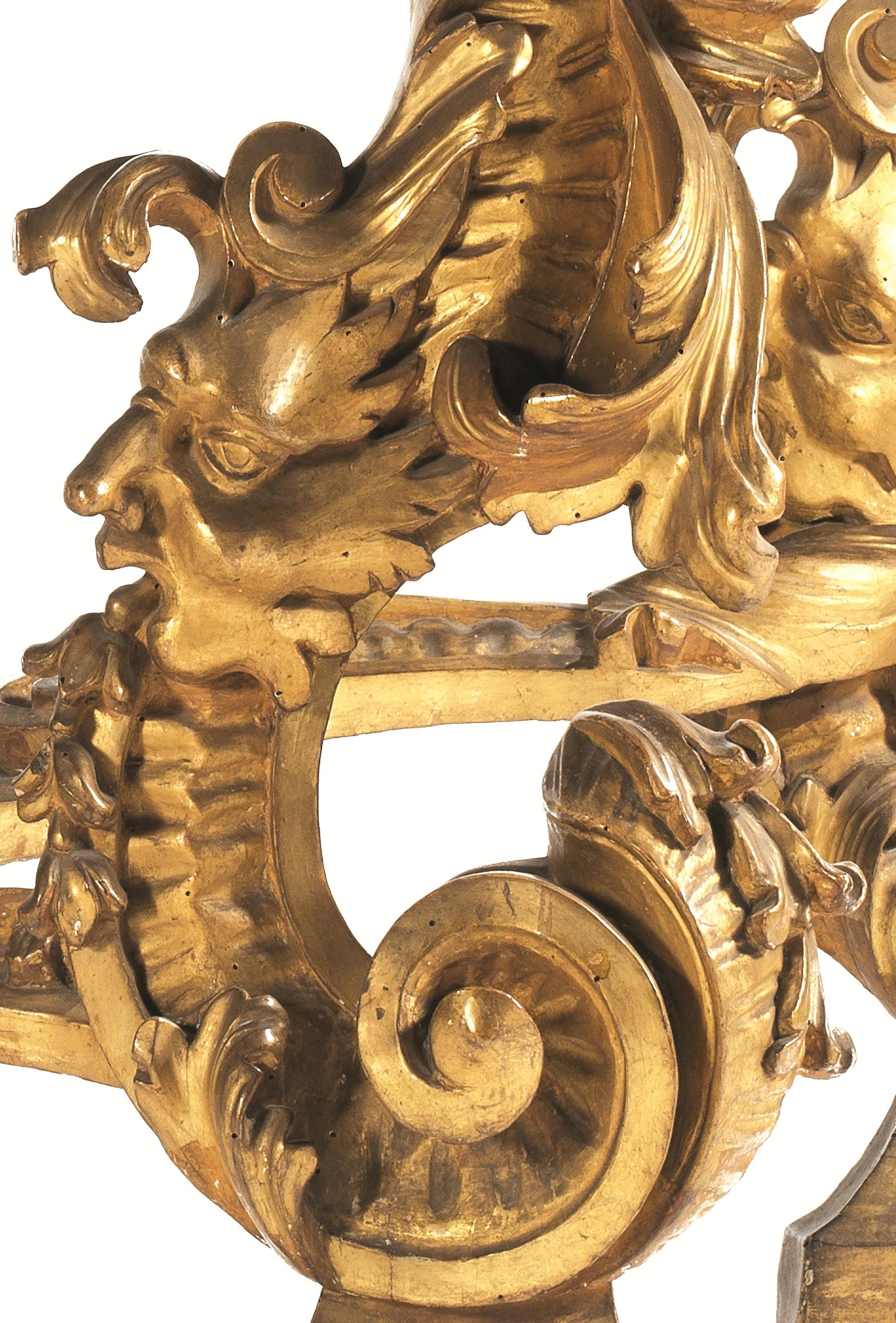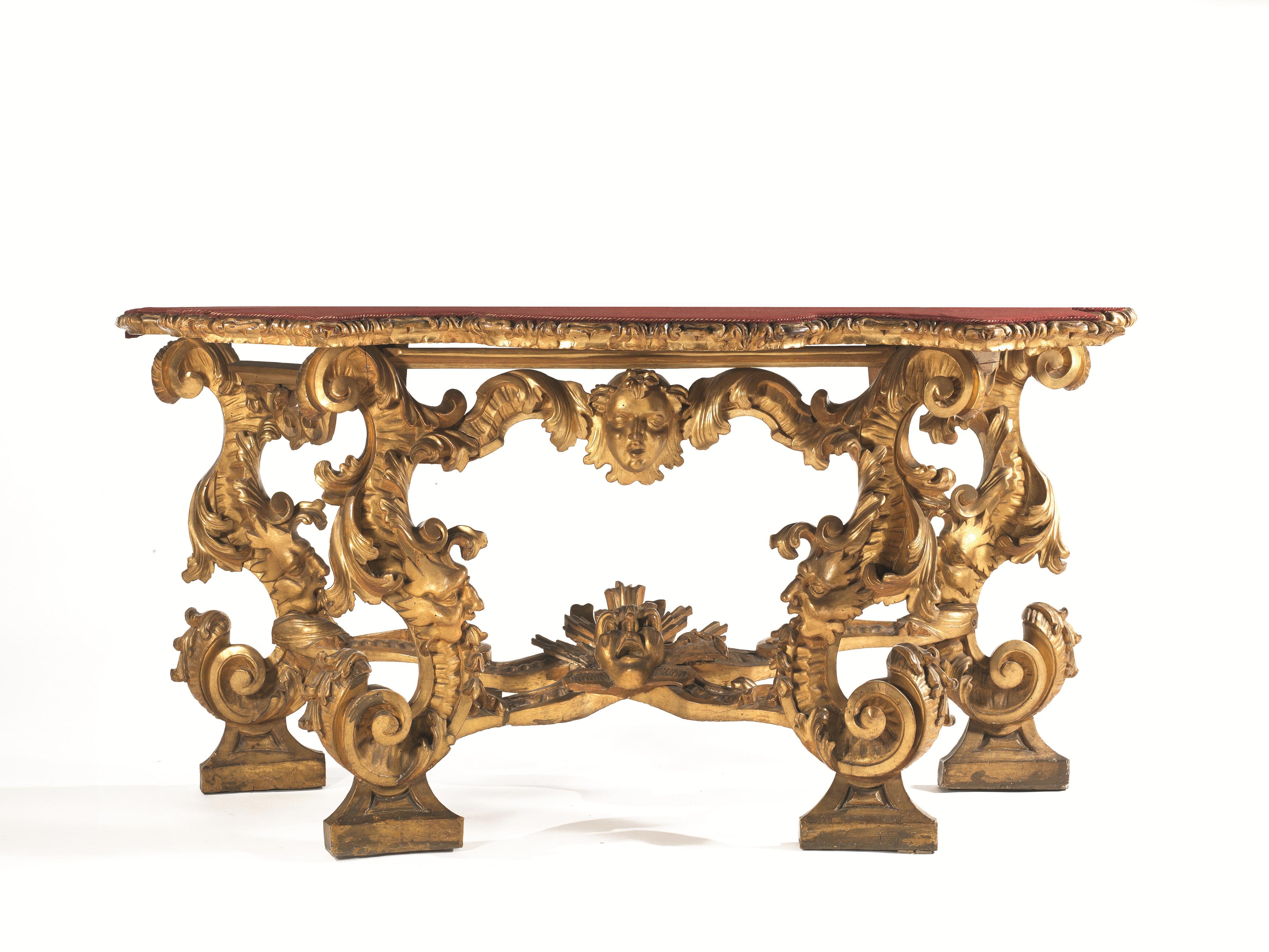 in legno intagliato e dorato, piano sagomato ricoperto di velluto rosso, becco di civetta intagliato a ovoli, gambe a volute contrapposte con volti antropomorfi nella parte mediana, riunite in alto da una traversa centrata da testa femminile e in basso da una crociera con mascherone, piedi a plinto, cm 183x71x89, piccoli danni