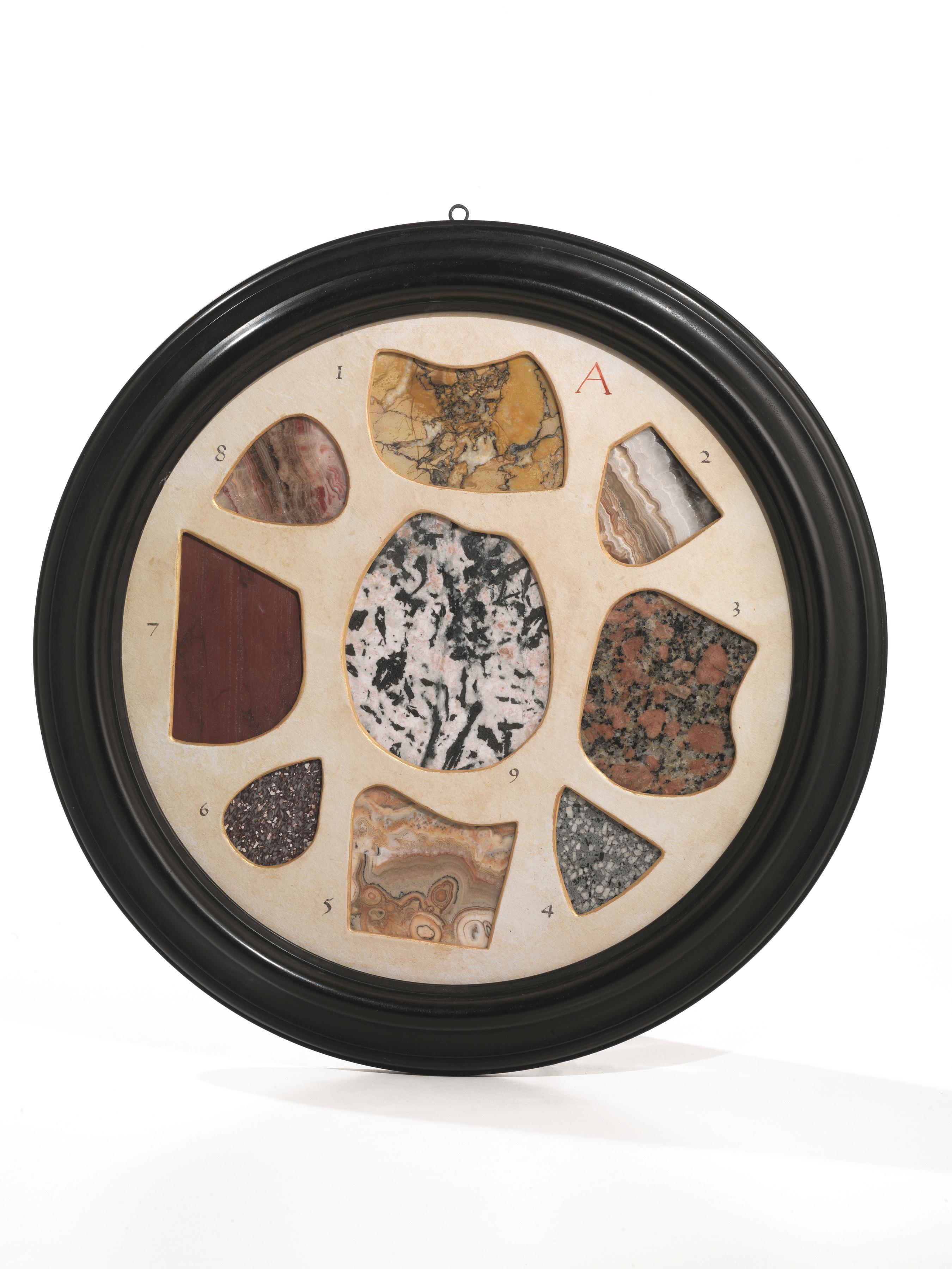 in ebano, contenenti all'interno pietre semipreziose e marmi: A) 1. broccatello di Siena, usato a partire dal XVI secolo, 2. alabastro listato o fiorito, 3 granito di Assuan, 4. porfido bigio, 5, alabastro fiorito dorato, 6. semesanto, 7. rosso ancito, 8. alabastro listato o fiorito, 9. granito della colonna; B) 1. cipollino, 2. porfido nero grafico, 3. alabastro listato di Palombara, 4. portoro, 5. alabastro listato o fiorito, 6. marmo luculleo (africano), 7. pavonazzetto, 8. granito della sedia di San Pietro, 9. fior di pesco, diam. cm 47 (2)