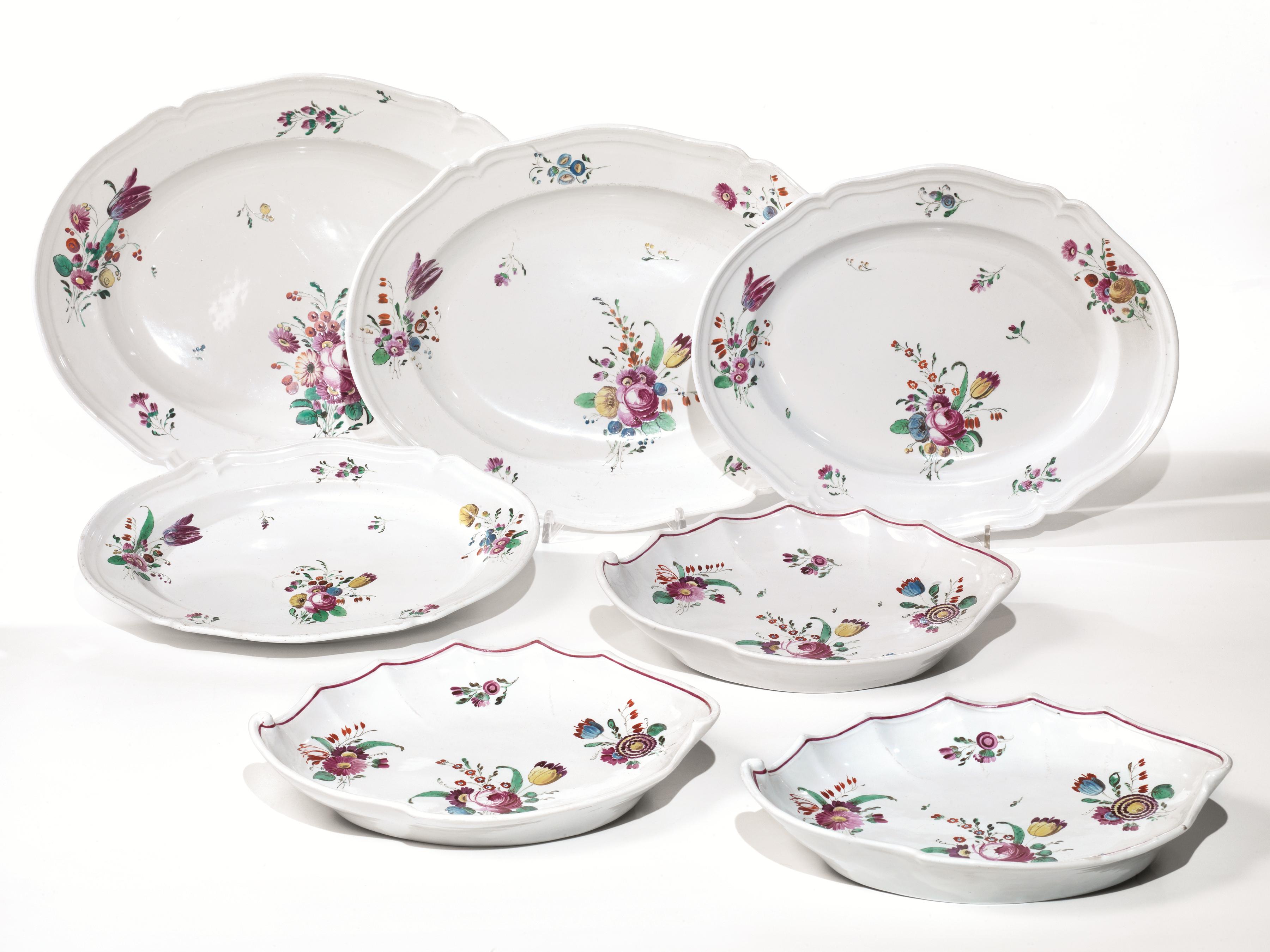 in porcellana decorata in policromia a mazzetti di fiori e fiori sparsi, cm. 37x28,5, 34,5x26, 30,5x24, 28x21; e TRE MARESCIALLE, MANIFATTURA GINORI A DOCCIA, FINE SECOLO XVIII, in porcellana decorata in policromia a mazzetti di fiori e fiori sparsi, cm 24,5x17,5