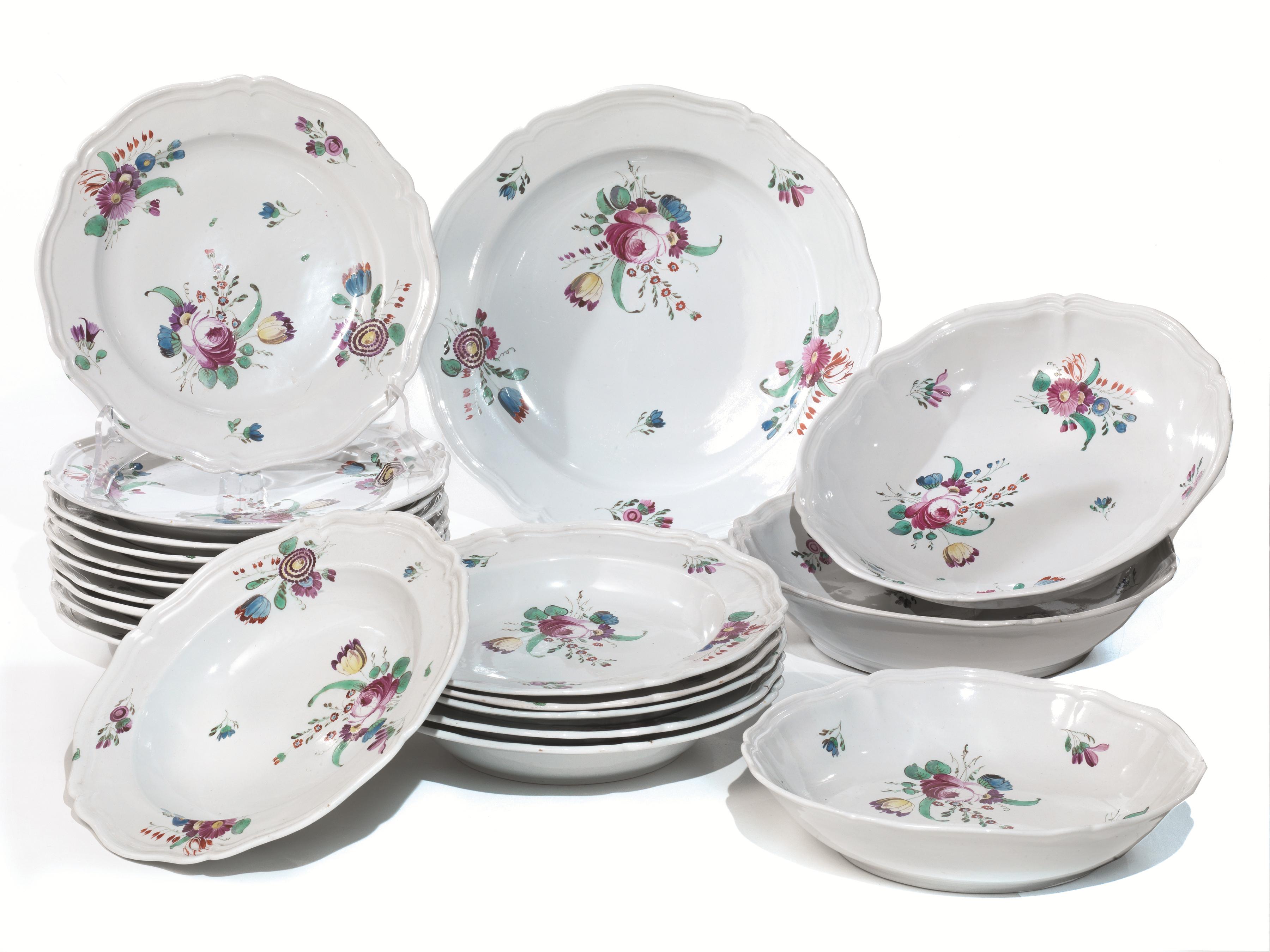 in porcellana decorata in policromia a mazzetti di fiori e fiori sparsi composto da dieci piatti piani, sei piatti fondi, un vassoio circolare e tre risottiere,