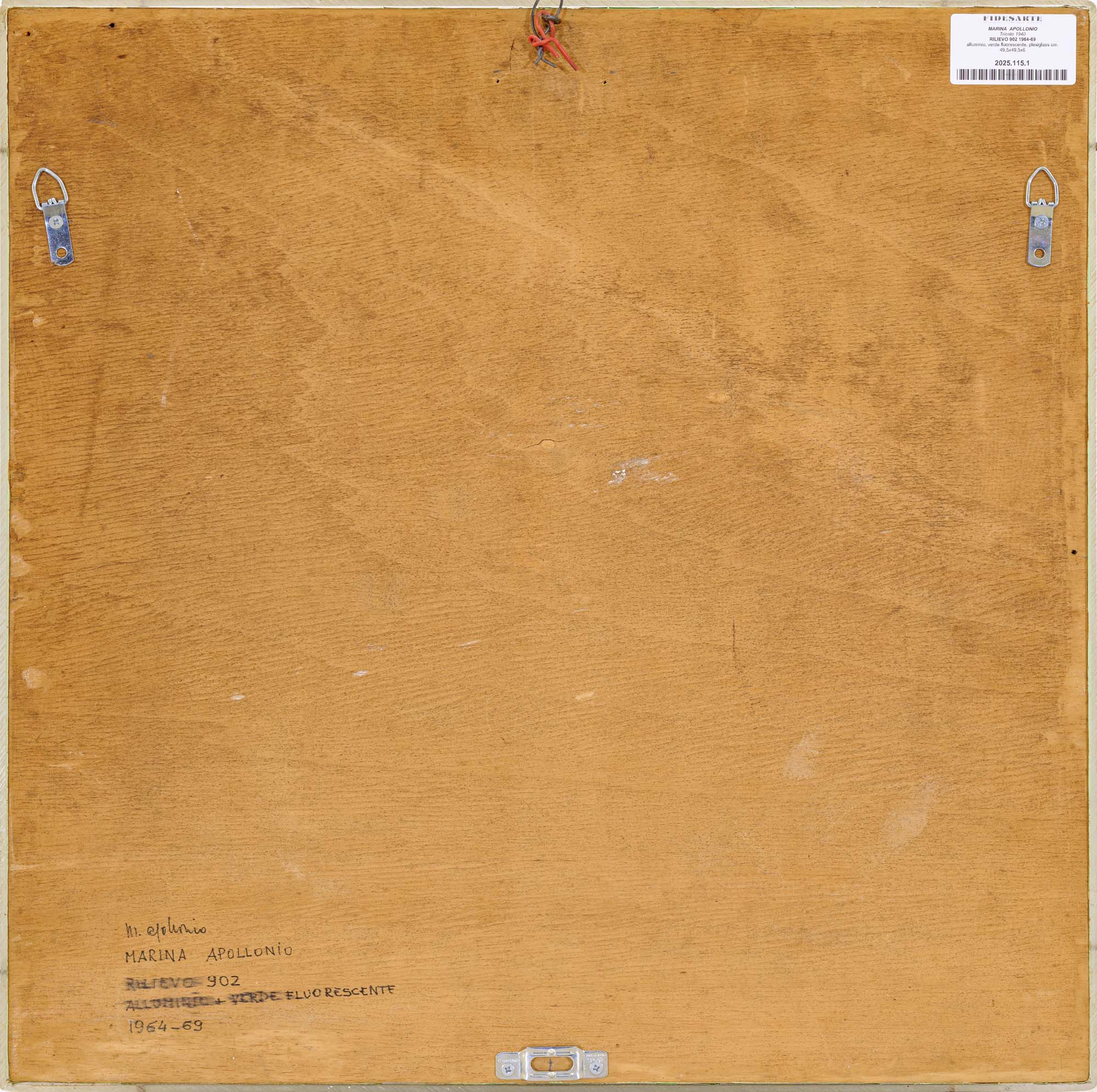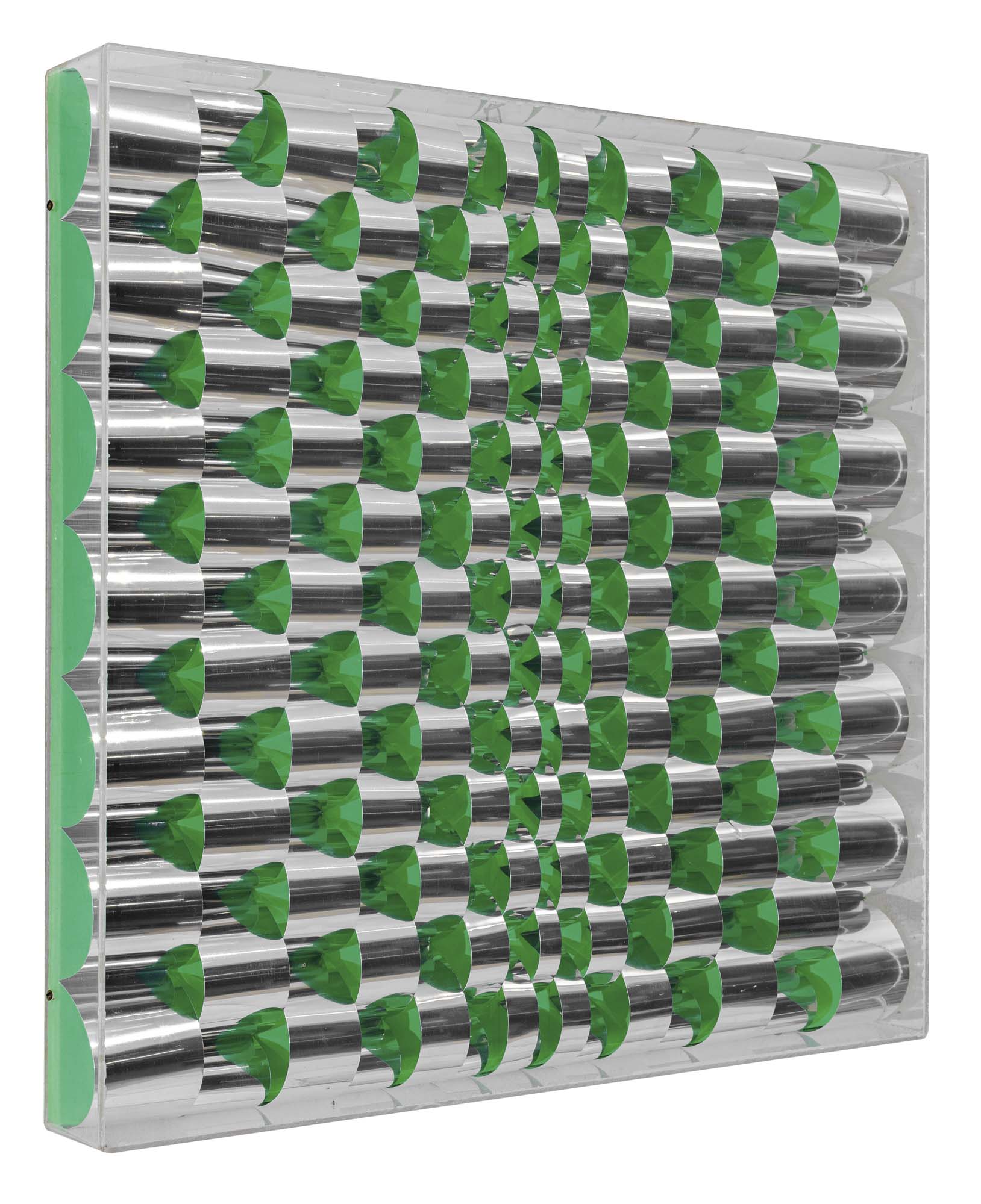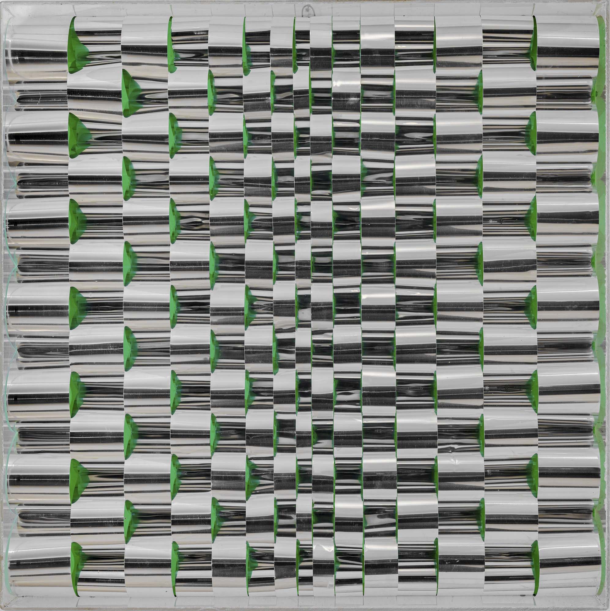 alluminio, verde fluorescente, plexiglass cm. 49,5x49,5x6
