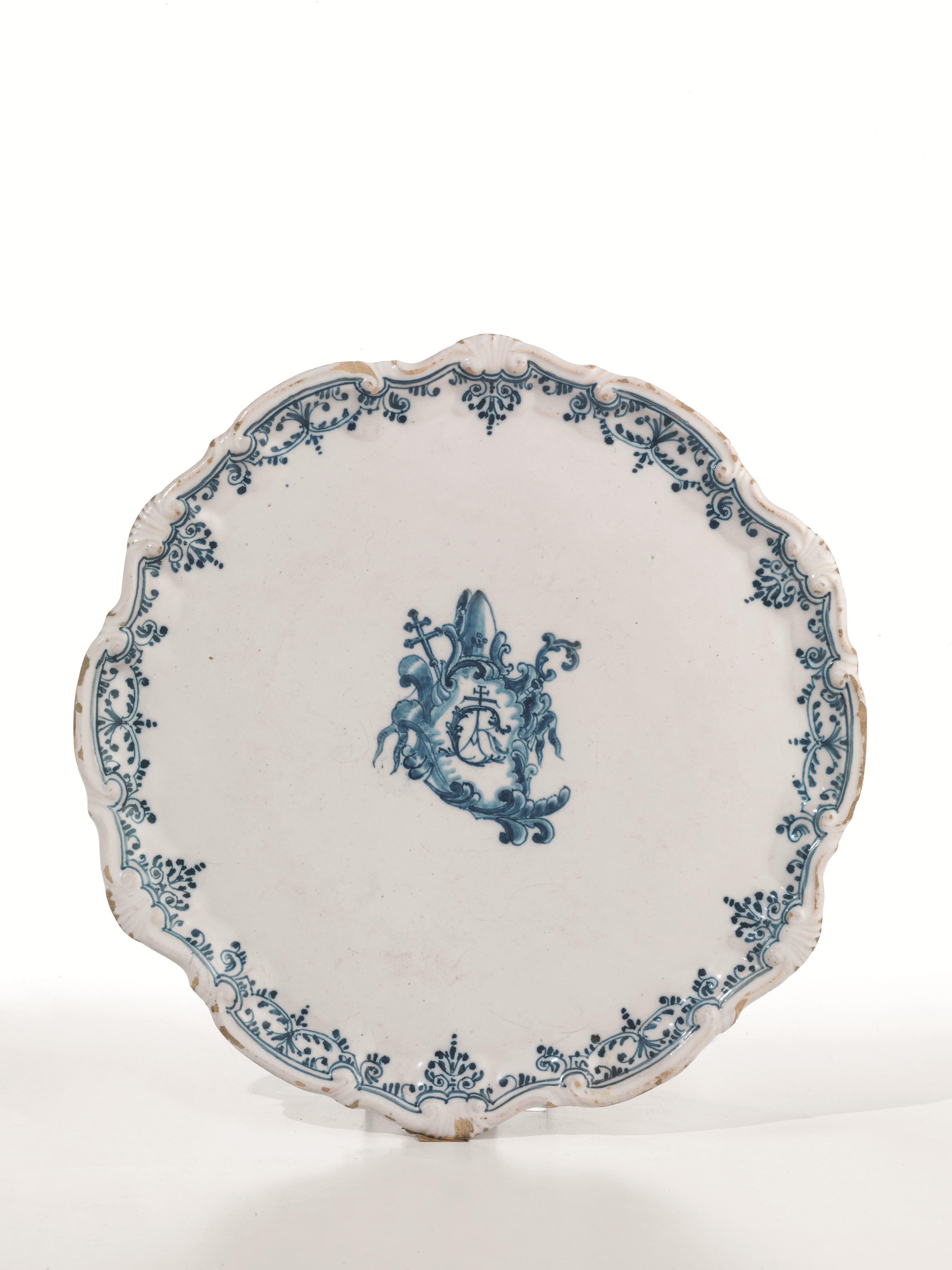 in maiolica decorata in monocromia blu di cobalto, bordo mosso da volute a rilievo e dipinto con un motivo a “merletto” ad andamento radiale lungo il perimetro interno. Al centro del piatto si legge l’emblema della Certosa di Calci con la sigla “CAR” (dal latino cartusia), sovrastato dagli attributi di croce, mitra e pastorale per la carica di Abate conferita al Priore Giuseppe Alfonso Maggi. Nel 1765 è documentato l’ordinativo di 395 pezzi di vasellame stemmato alla manifattura Ginori a Doccia, nel periodo in cui il priore si era reso era fautore di un articolato progetto di ristrutturazione dell’intero complesso monastico. Del cospicuo servito originario in maiolica restano oggi solo pochi esemplari noti, fra i quali quello in esame, diam. cm 25