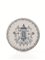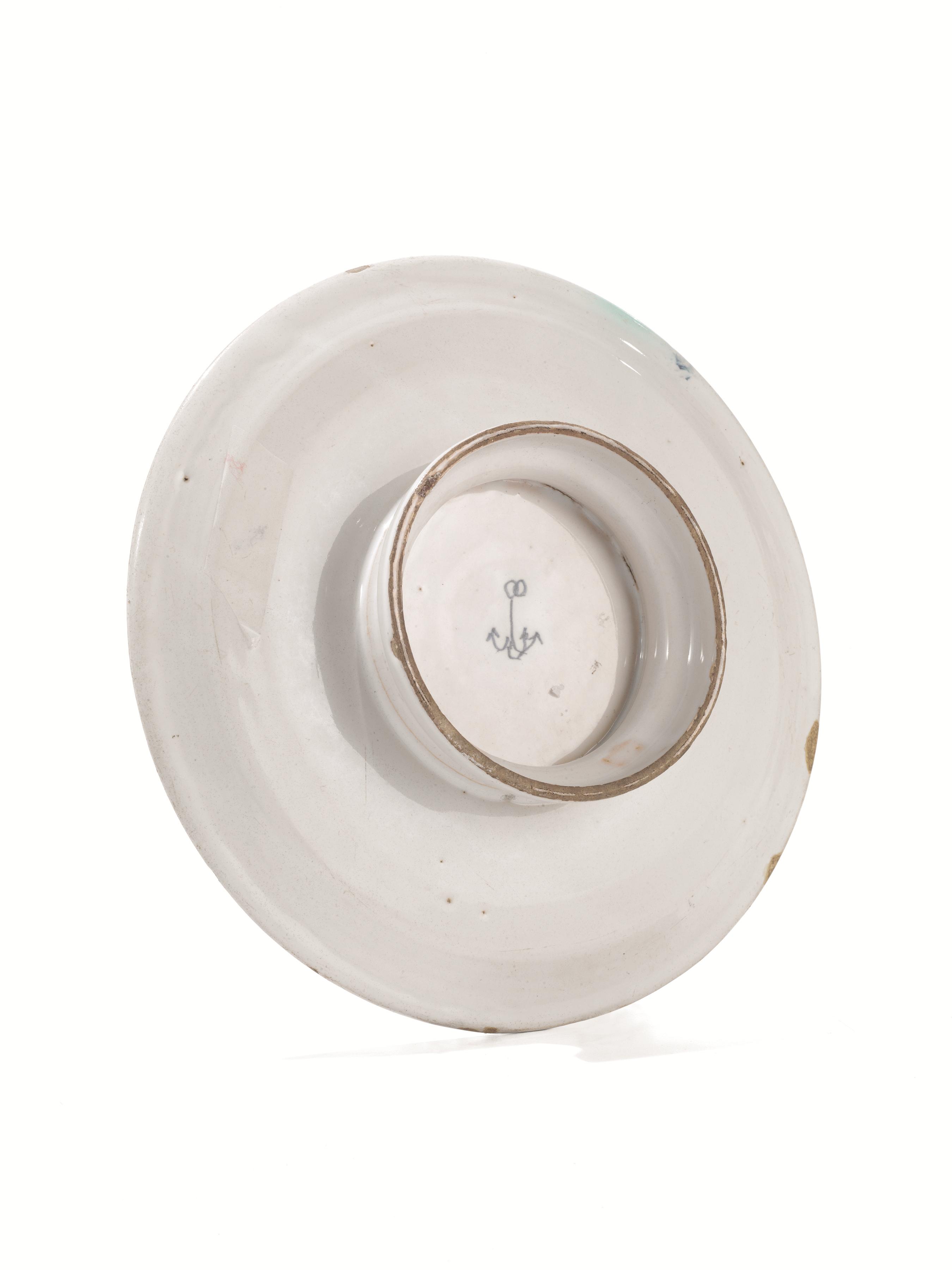 in maiolica decorata in monocromia blu di cobalto con una bordura a “merletto” ad andamento radiale entro il bordo, a incorniciare una rara interpretazione dei noti modelli ornamentali del francese Jean Bérain 1637-1711. Al verso marca ad àncora, diam. cm 22,5