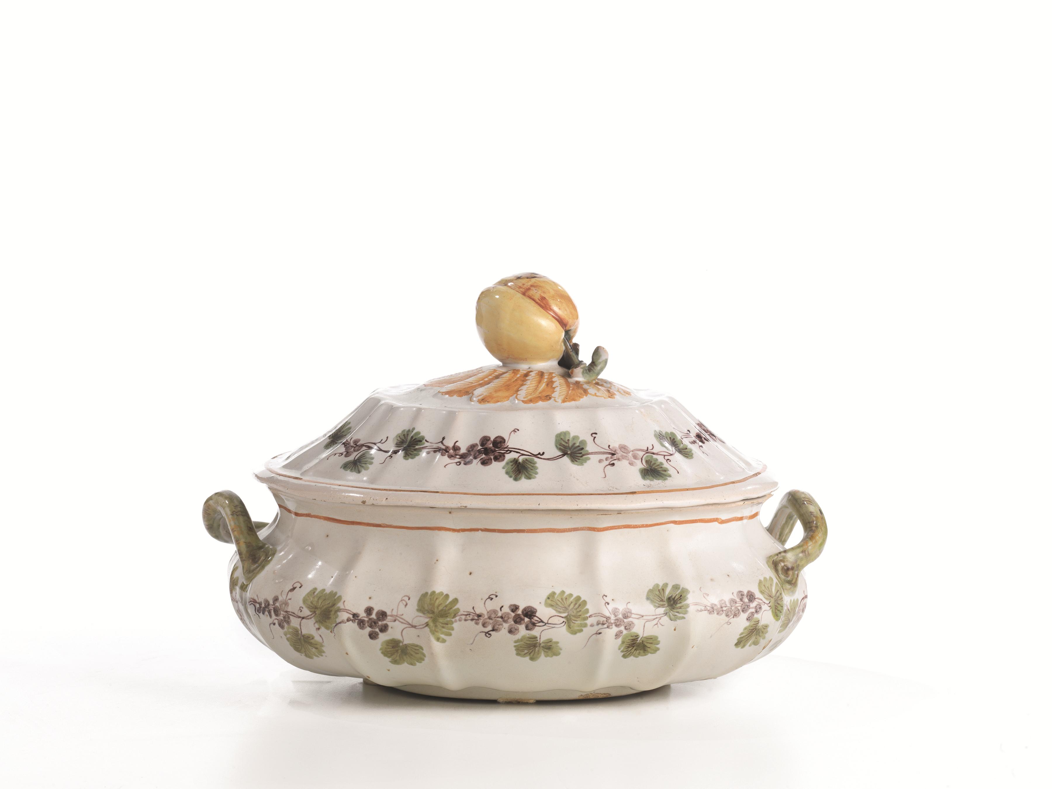 in maiolica decorata in policromia con verde, manganese nei toni del marrone e del viola, di forma ovoidale, corredata di anse modellate e dipinte a trompe-l’oeil a guisa di rametti e presa del coperchio a frutto, decorata a gran fuoco in bicromia verde e manganese con un motivo composto da tralci di vite e pampini, che si sviluppano attorno alla parete centrale del corpo e sul coperchio. Quest’ultimo è ravvivato da una teoria di larghe foglie rilevate e lumeggiate in giallo-arancio alla base della presa. Questo esemplare è opera di notevole rarità essendo, al presente, l’unica zuppiera nota con tale ornato, definito nei documenti di fabbrica “à vite”, unitamente ad altri otto manufatti, cm 18x26,5x19