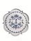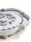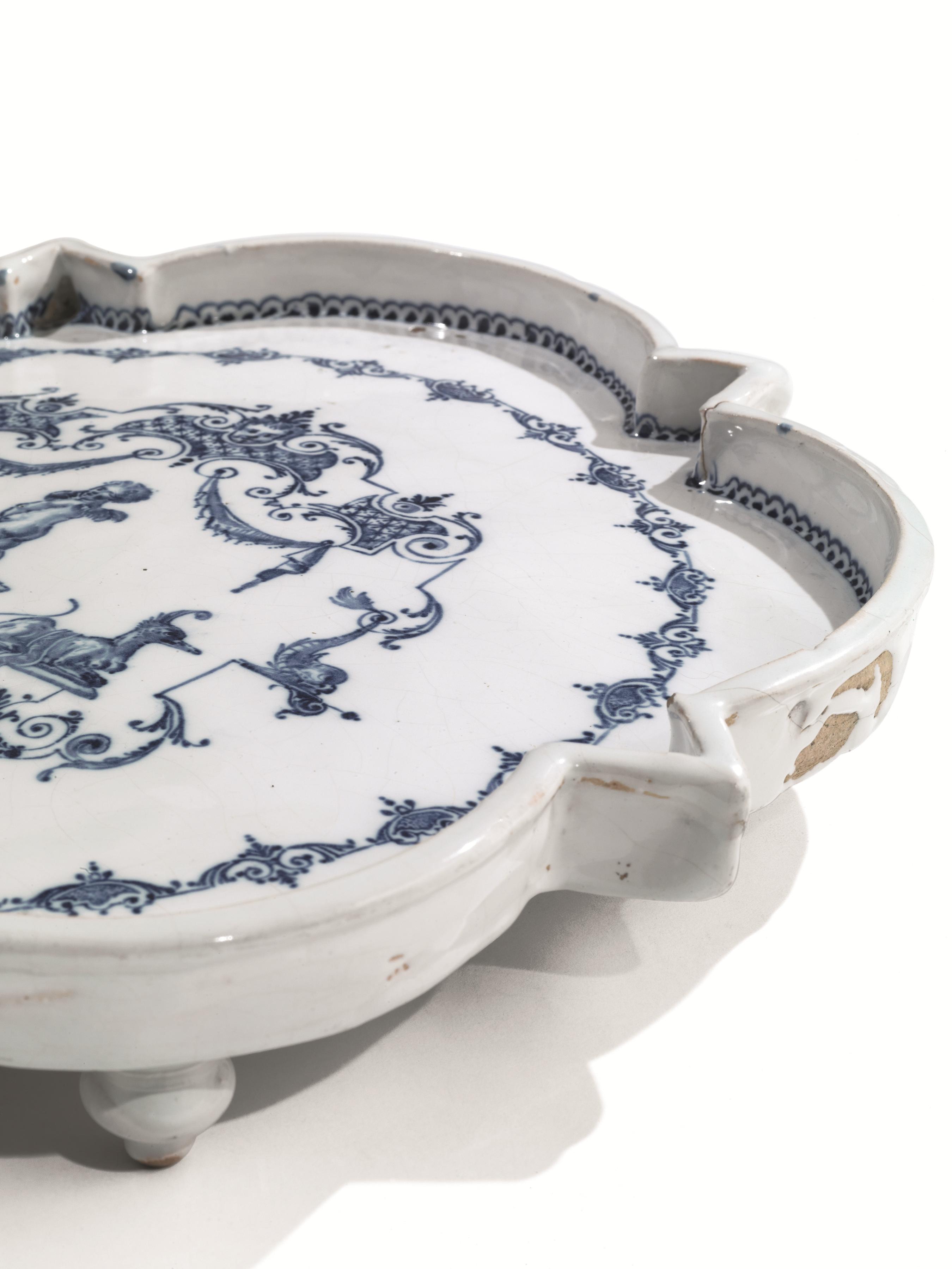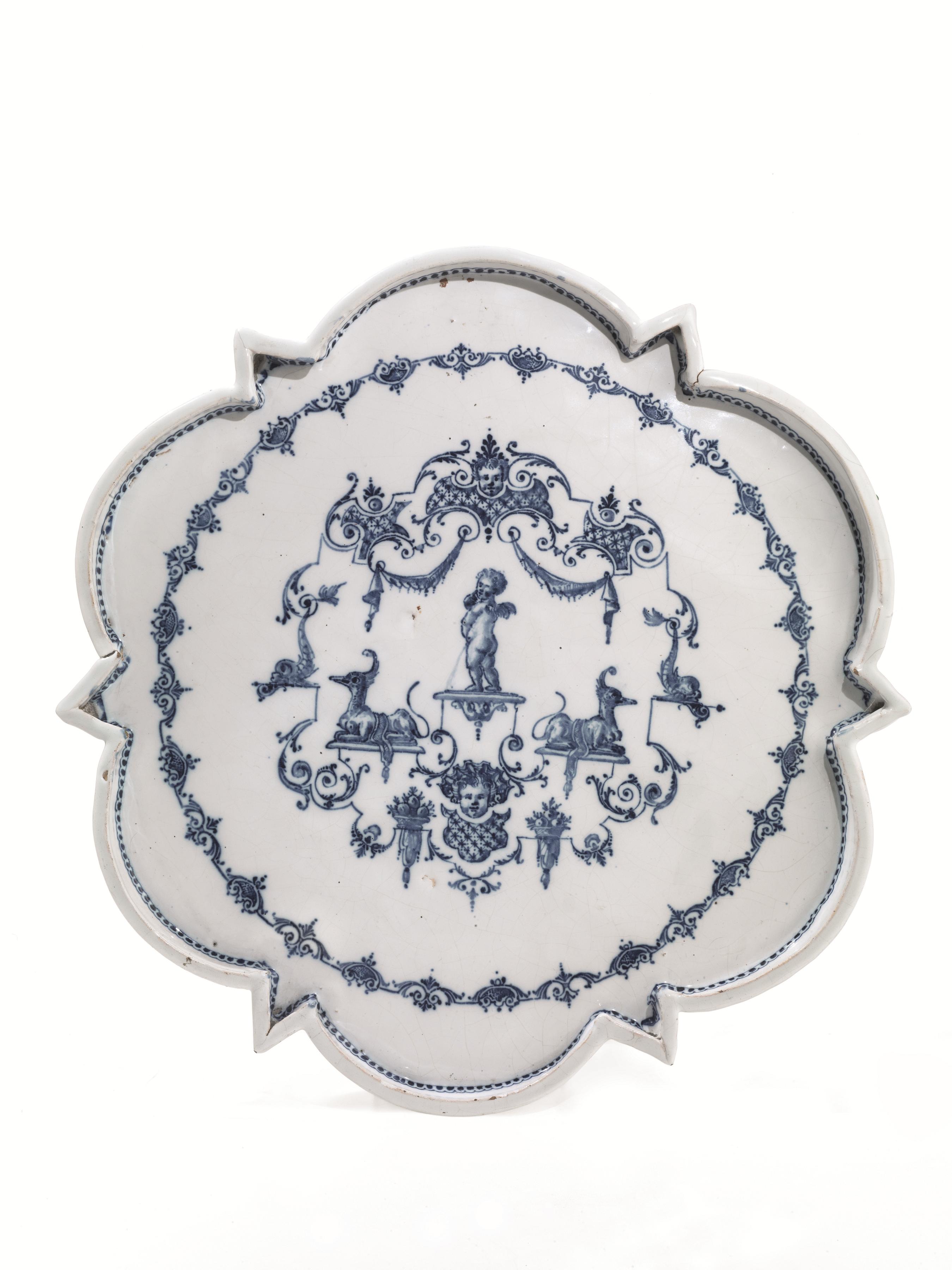 in maiolica dipinta in monocromia blu di cobalto, orlo mistilineo e quattro piedini a rocchetto, dipinto con una composizione alla Bérain, con al centro una figura di amorino attorniato da una complessa struttura ad arabeschi, volute, mascheroni, tendoni e animali fantastici su piani sospesi. Una bordura a “merletto” incornicia l’insieme, mentre attorno all’orlo corre una greca ad archetti. L’impianto formale e il segno fine e minuto richiamano le opere dei Rossetti nel periodo torinese (1725-1727), o in quello immediatamente successivo al rientro da Lodi nel 1736, diam. cm 39,5