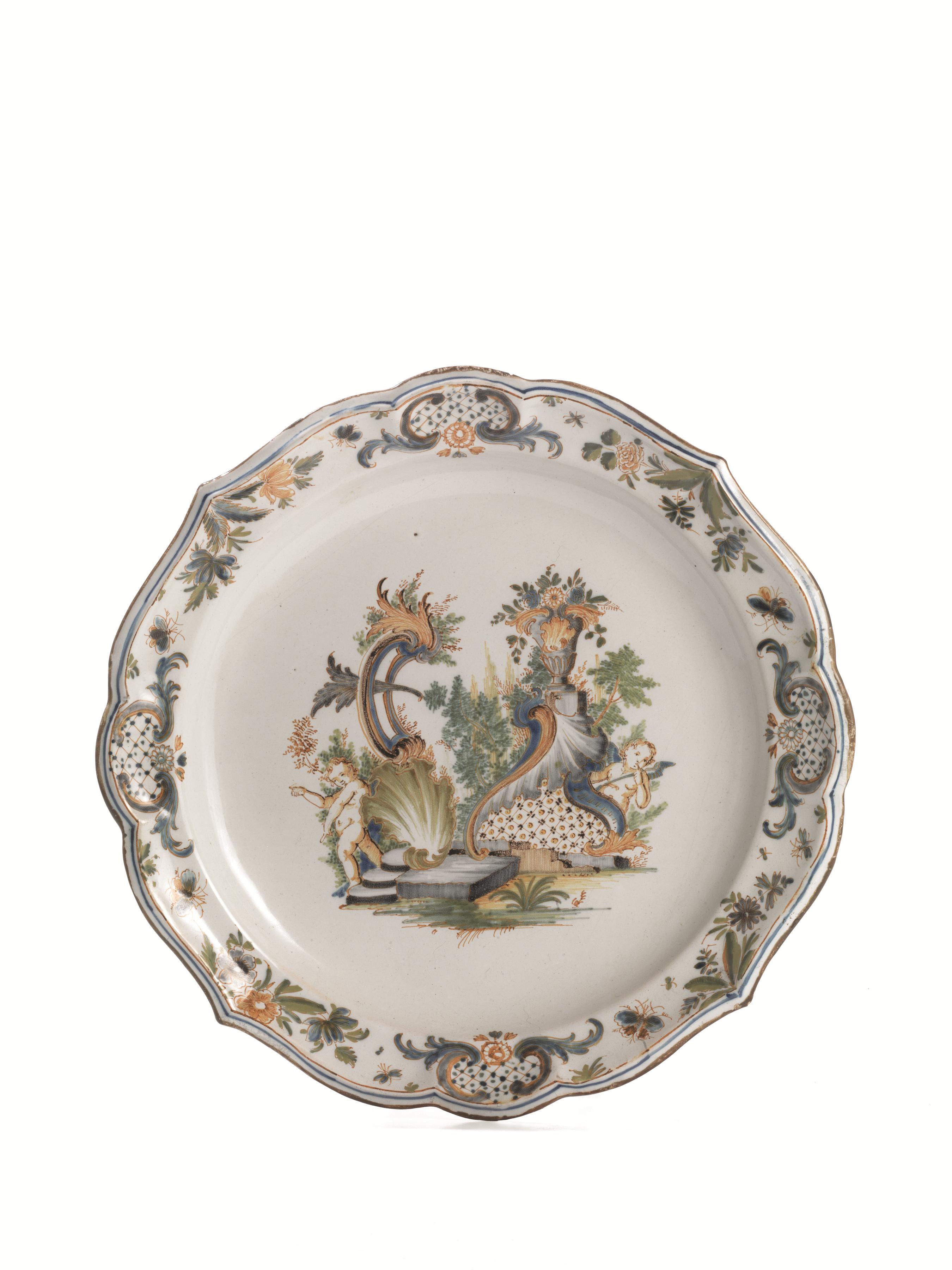 in maiolica dipinta in policromia a gran fuoco con verde, giallo, giallo arancio, blu, bruno di manganese; cavetto largo e basso che termina in una breve tesa dall’orlo mistilineo, al centro decorato con una scena di putti tra svolazzi roccocò. Sulla tesa una teoria di ciuffi floreali di ispirazione orientale si alternano a volute e graticci, fra cui si librano insetti. Il decoro, noto con il termine “rocaille figuré”, contraddistingue i prodotti della manifattura torinese dei Rossetti e fu adottato anche dalla manifattura Torinese Ardizzone, diam. cm 31