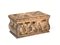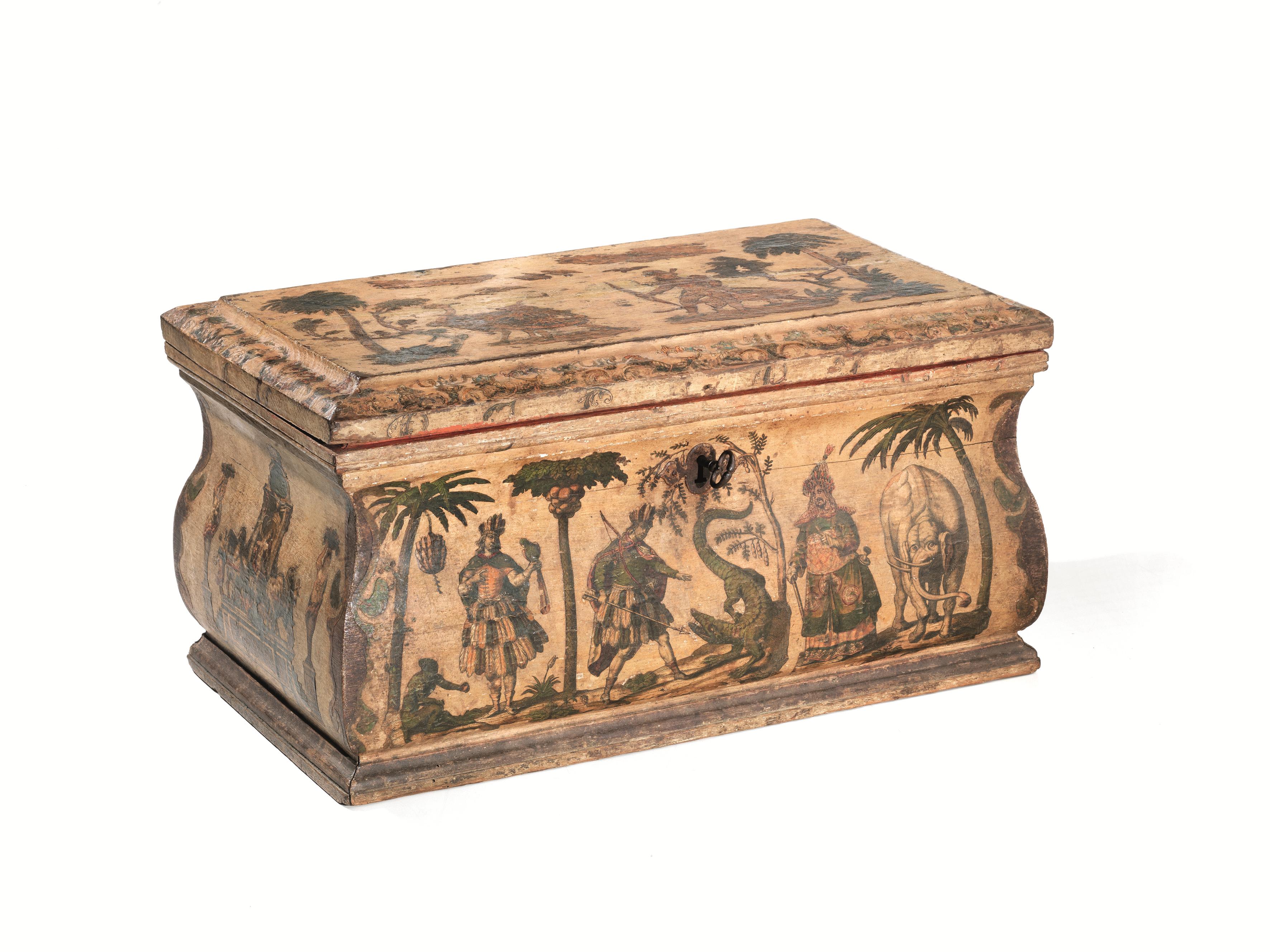 in legno laccato di forma bombata interamente decorata ad arte povera sui lati e sul coperchio, con figure e animali esotici e con costruzioni architettoniche,
