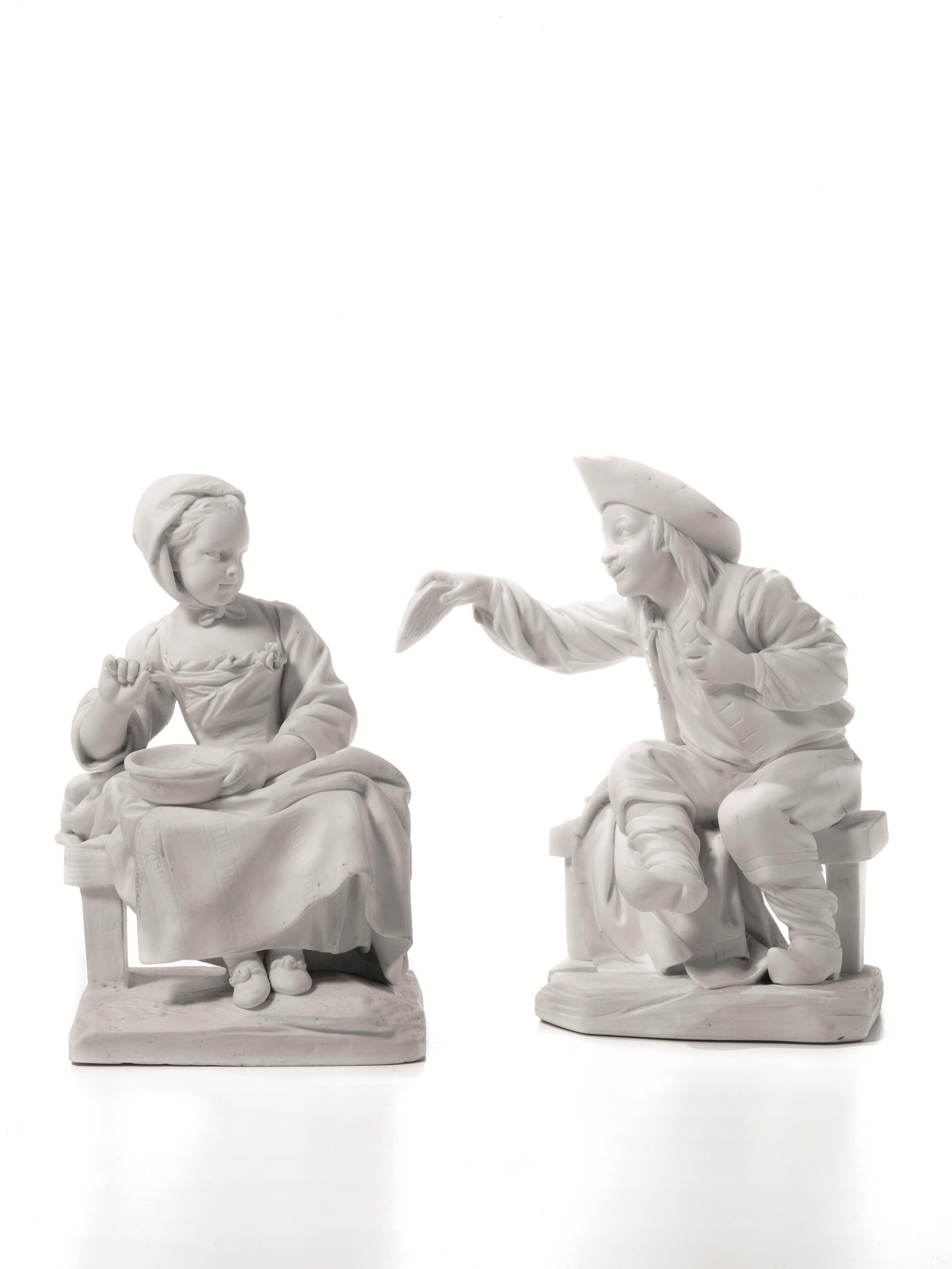in bisquit, concepiti per formare una coppia e raffiguranti rispettivamente “la mangeuse de bouillie” e “le trempeur de mouillettes”. I due biscuit , della manifattura di porcellane di Sèvres, sono ben noti agli studi: la fanciulla è citata nell’inventario di fabbrica del 1756 ed il ragazzo nei documenti del 1763 (cfr. A. Fay-Hallée, T. Préaud, Porcelaines de Vincennes. Les origines de Sèvres, 1977, p. 182, per una discussione circa la datazione del model- lo maschile; fig. 498, per quello femminile). Entrambi i modelli, che spettano allo scultore Suzanne, si ispirano all’opera di Boucher e rientrano nei suoi celebrati Enfants Vincennes Boucher (cfr. A. Ananoff, François Boucher - Peintures, II, 1976, p. 103, n. 414, per la derivazione della giovane contadina). Entrambe le figure recano una “F” incisa sotto la base, identificativa di Étienne Falconet, direttore del dipartimento di scultura a Sèvres dal 1756 al 1766 (cfr. Falconet à Sèvres, catalogo della mostra al Musée National de Cèramique de Sèvres, 2001, p. 25). La figura femminile riporta anche la segnatura di una stella, figura femminile alt. cm 19,2, figura maschile alt. cm 20,2