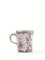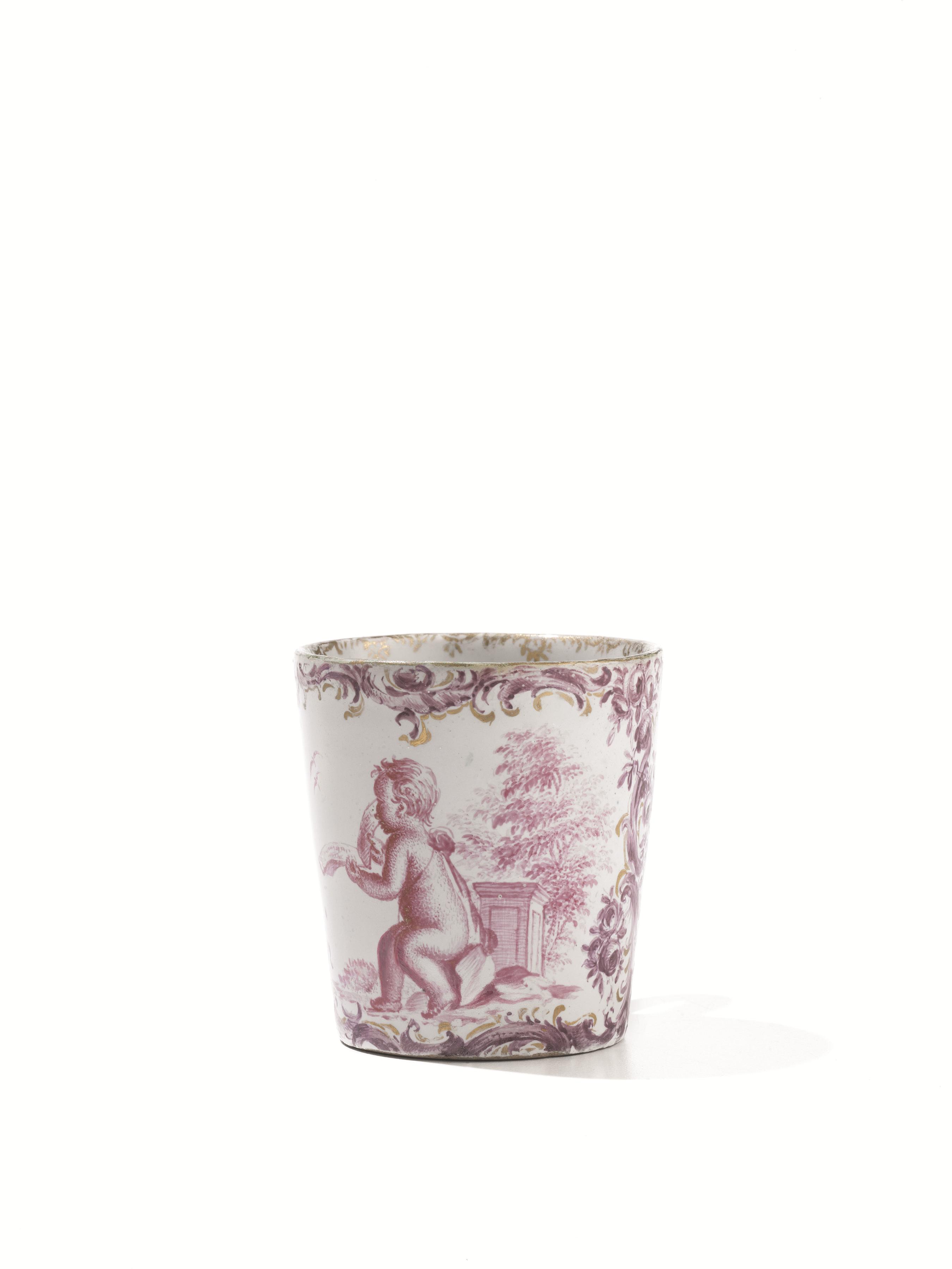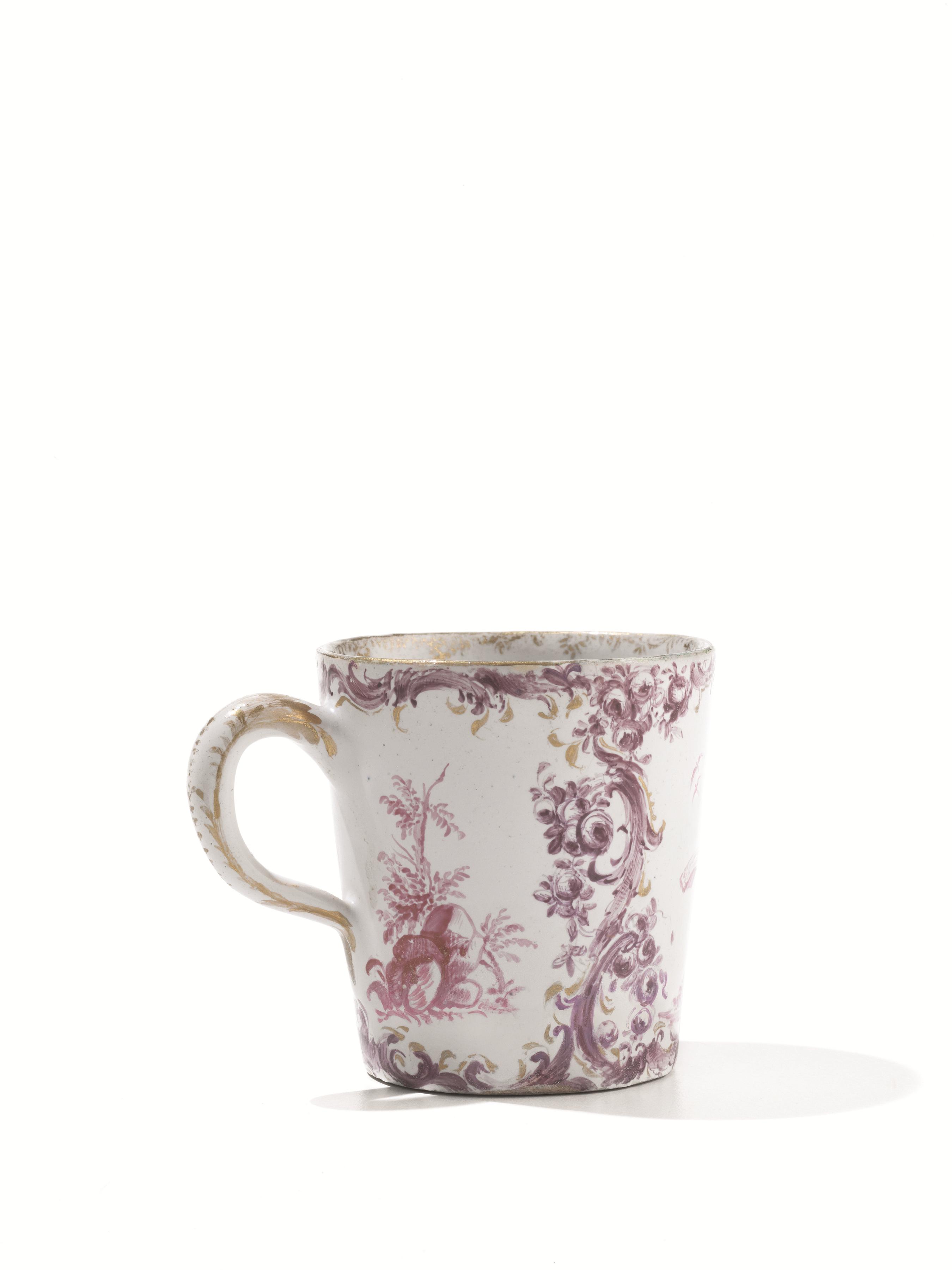 in maiolica dipinta a piccolo fuoco in due toni di porpora e lumeggiata in oro, forma cilindrica con parete appena rastremata e ansa ad orecchio. Il motivo ornamentale si sviluppa delineando due raffinate riserve con cascate floreali tra volute rocaille, a contenere frontalmente la figura di un putto seduto con un libro aperto fra le mani. Sul retro alcuni elementi rocciosi con ciuffi vegetali. La scelta cromatica e l’inconfondibile maniera pittorica ci portano ad attribuire l’opera a Paolo Milani (1746-1822), alt. cm 7
