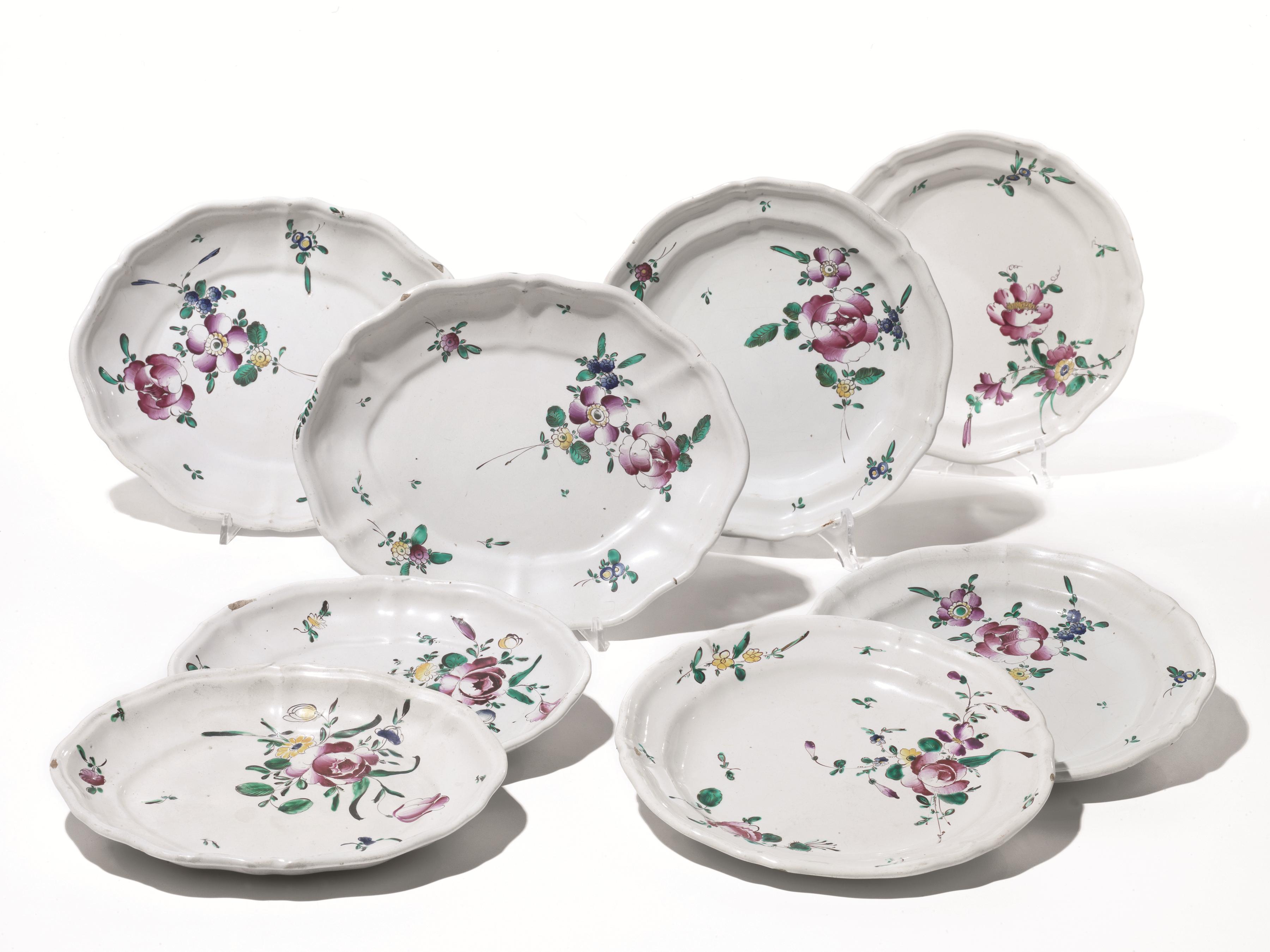 in maiolica dipinta a piccolo fuoco in policromia con rosso porpora, verde, giallo blu e tocchi di manganese. L’insieme è composto da quattro piatti tondi e da due coppie di ovali di diverse misure, accomunati da una decorazione a piccolo fuoco con mazzetti floreali naturalistici del tipo “contornato”, decoro che prevede un mazzo dominante, a cui fanno da contorno gruppi sparsi minori o rametti singoli. Le caratteristiche formali e stilistiche sono tipiche della manifattura Ferretti di Lodi. Al verso pennellata blu tracciata in blu sul fondo, piatti tondi diam. cm 24; ovali cm 23x19,5 e cm 27,5x 22,5. (8)
