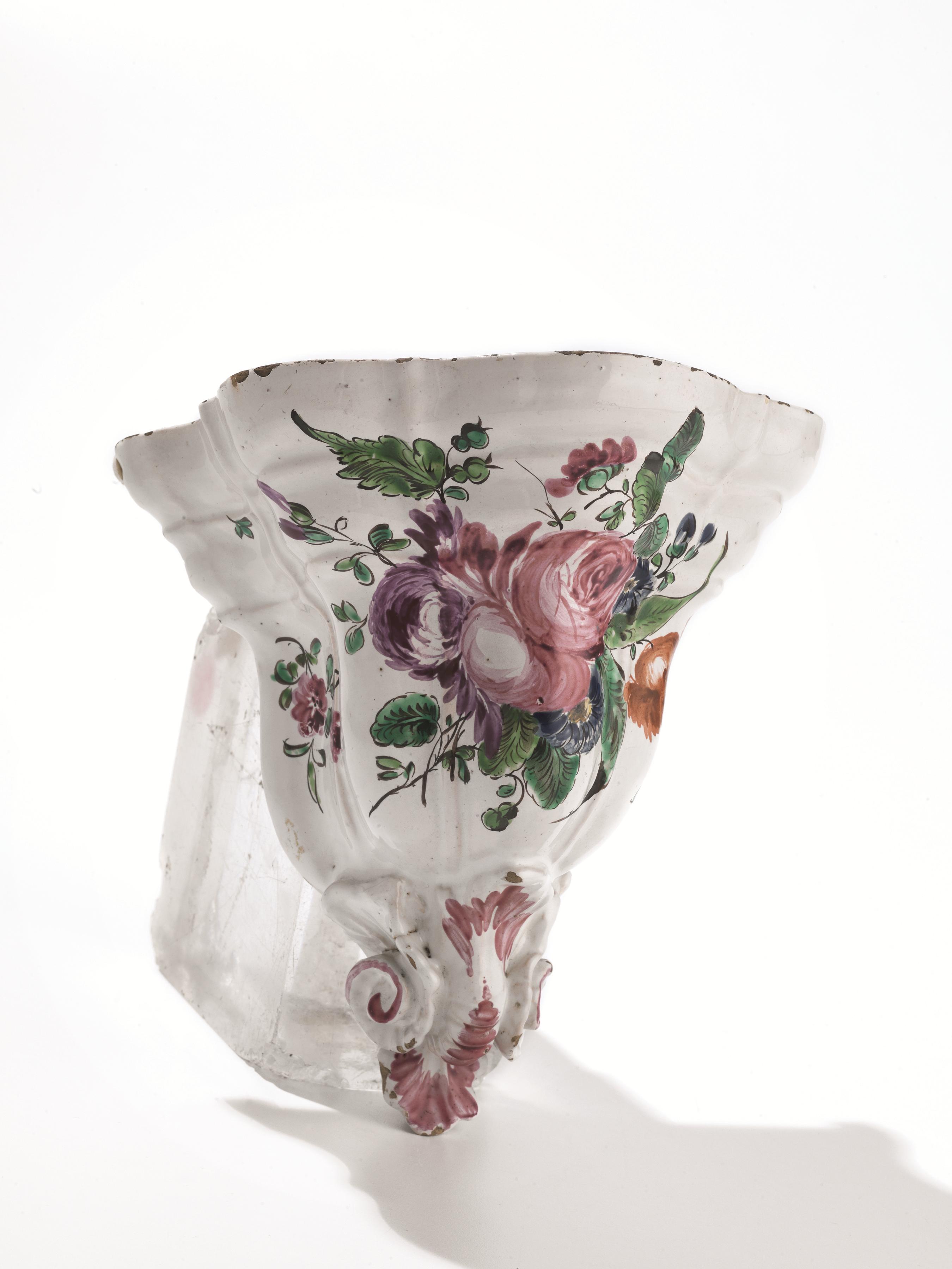 in maiolica decorata a piccolo fuoco con porpora, verde, blu e giallo e rosso, corpo fortemente sagomato su una base costituita da corpose volute lumeggiate in porpora, decorato con un grande mazzo floreale di gusto naturalistico. Tale mensola è una raffinata e rara testimonianza della produzione milanese di Pasquale Rubati verso il 1770, alt. cm 33