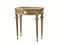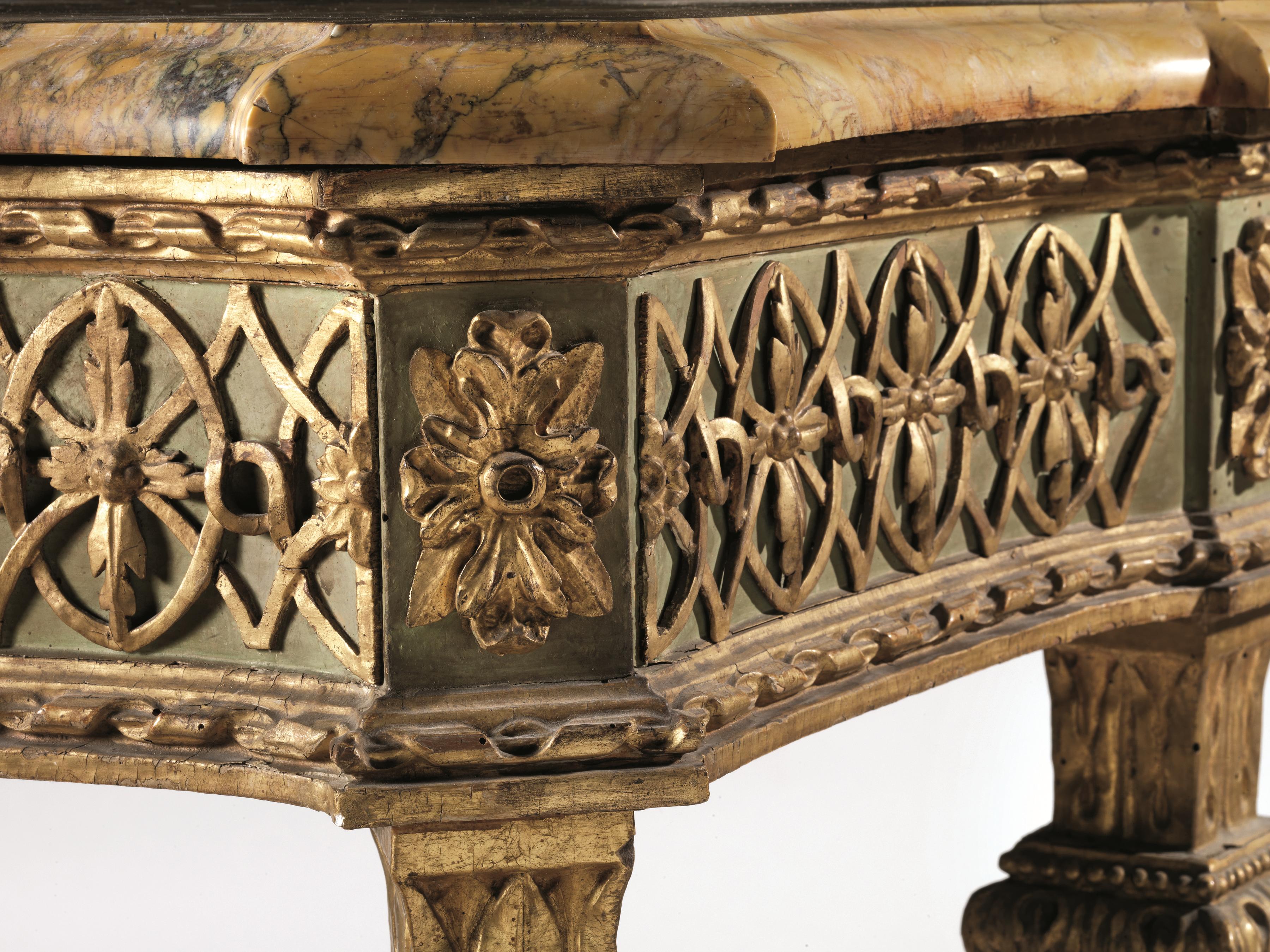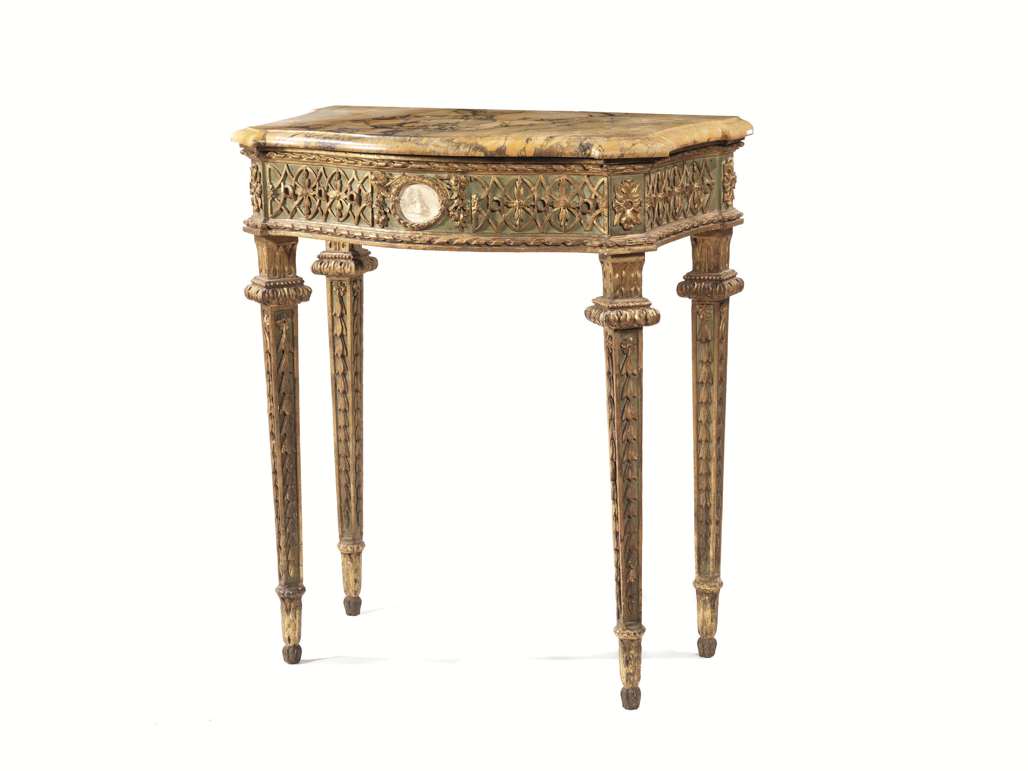 in legno intagliato, dorato e dipinto in verde acqua, piano sagomato in marmo giallo di Siena, fascia decorata da motivo a grata e centrato da una medaglione con scena classica, alte gambe troncopiramidali con collarino superiore e piedi a cespo d'acanto, cm 87x53x100