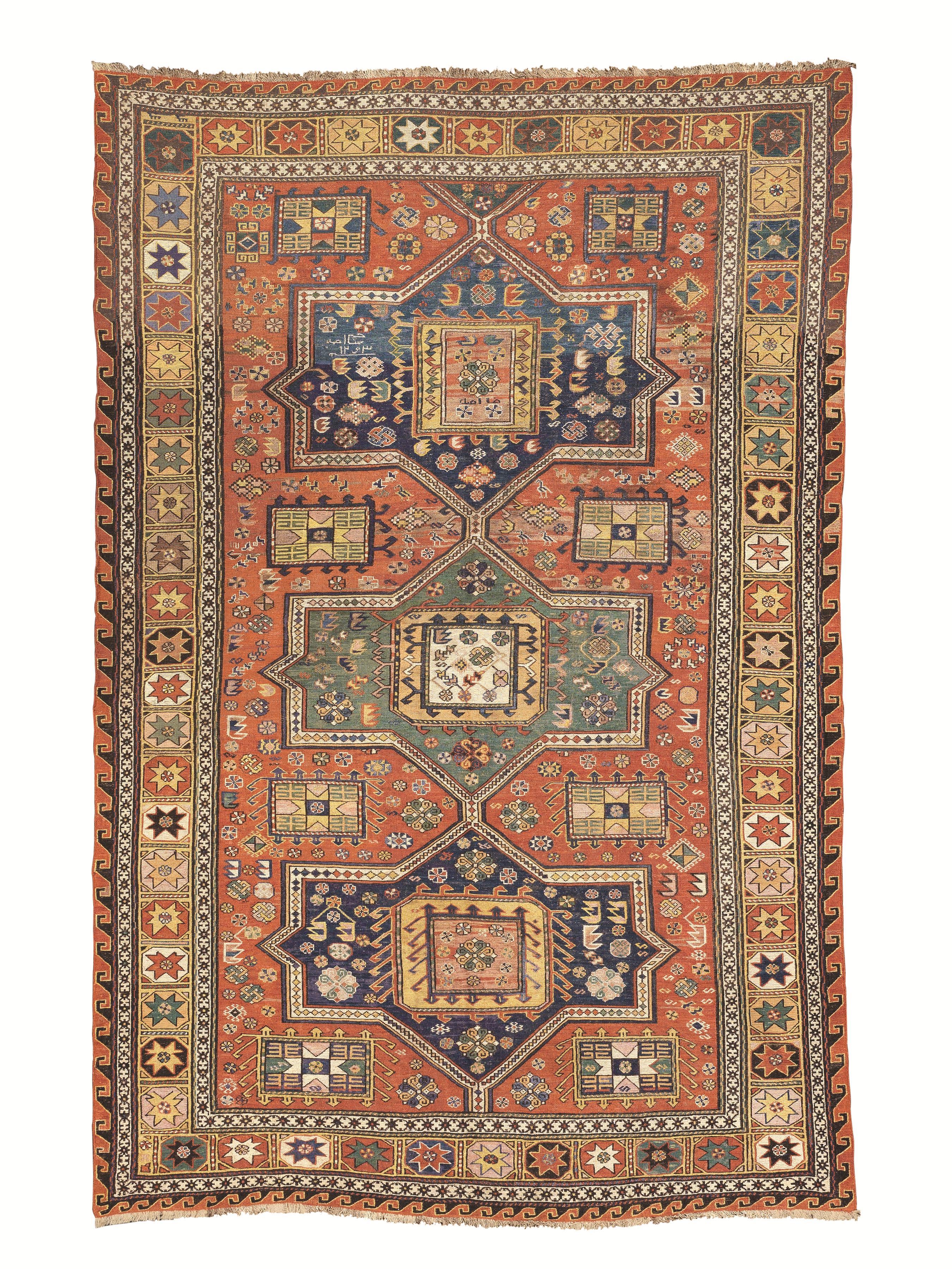 TAPPETO SUMAKH CAUCASICO, META' SECOLO XIXfondo rosso mattone con tre...