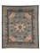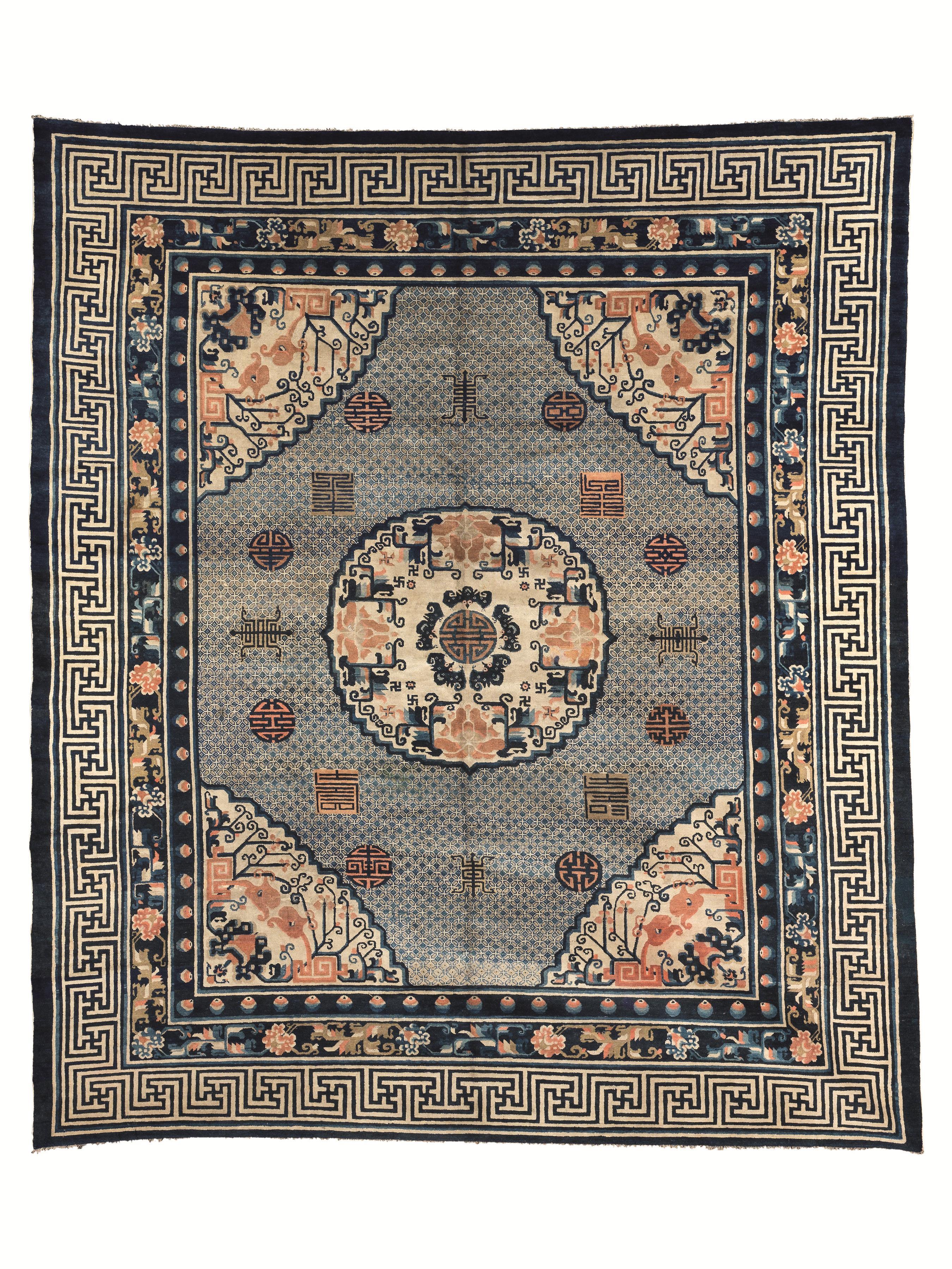 fondo avorio, campo cosparso da piccole decorazioni azzurre e motivi cinesi, al centro medaglione avorio con peonie rosa e blu, bordura avorio con decoro a greca blu, cm 360x315