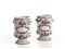 in maiolica decorata a piccolo fuoco in policromia con rosso, verde, giallo, bruno di manganese, corpo a rocchetto con decoro alla “rosa contornata” e cartiglio anepigrafo a rocaille in viola, arricchito da rametti di bacche; profili in verde e nero sottolineano la modellazione. Questo corredo apotecario è fra i più ricercati della manifattura bolognese Finck. Sotto la base sigla “F.” tracciata in azzurro (per le diverse modalità di marcatura si veda C. Campanella in “FAENZA”, XCIX, n. 2-2013, p. 45, figg. 5-6 “il Finimento n. 2 a porpora”, con preciso rimando alla decorazione del vassoio in esame), alt. cm 12,5 (2)