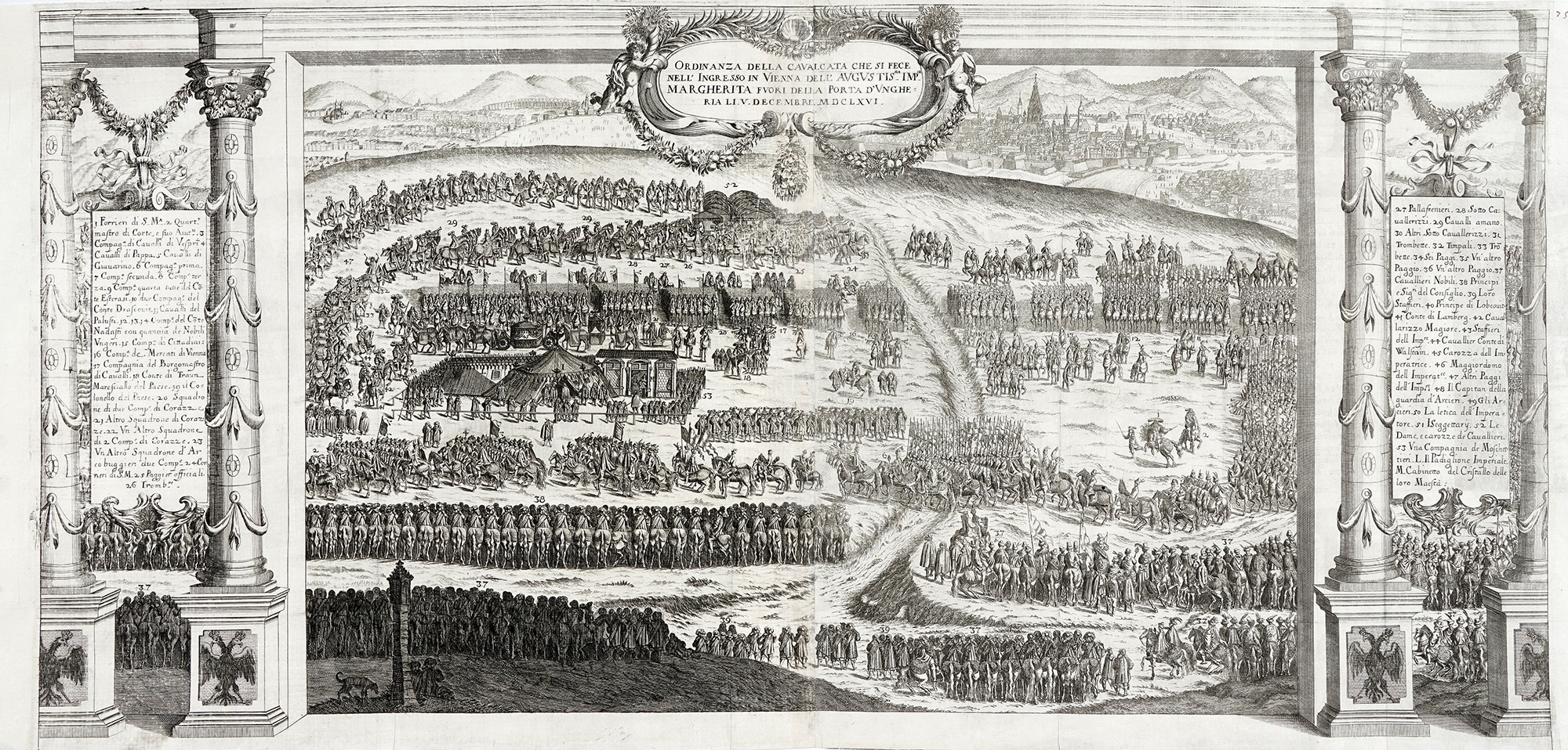 Galeazzo Gualdo Priorato, Ordinanza della cavalcata che si fece nell'ingresso in Vienna dell'Augustiss.ma Imp.ce Margherita fuori della Porta d'Ungheria li V Decembre MDCLXVI. Vienna: appresso G.B. Hacque, 1670-1674.