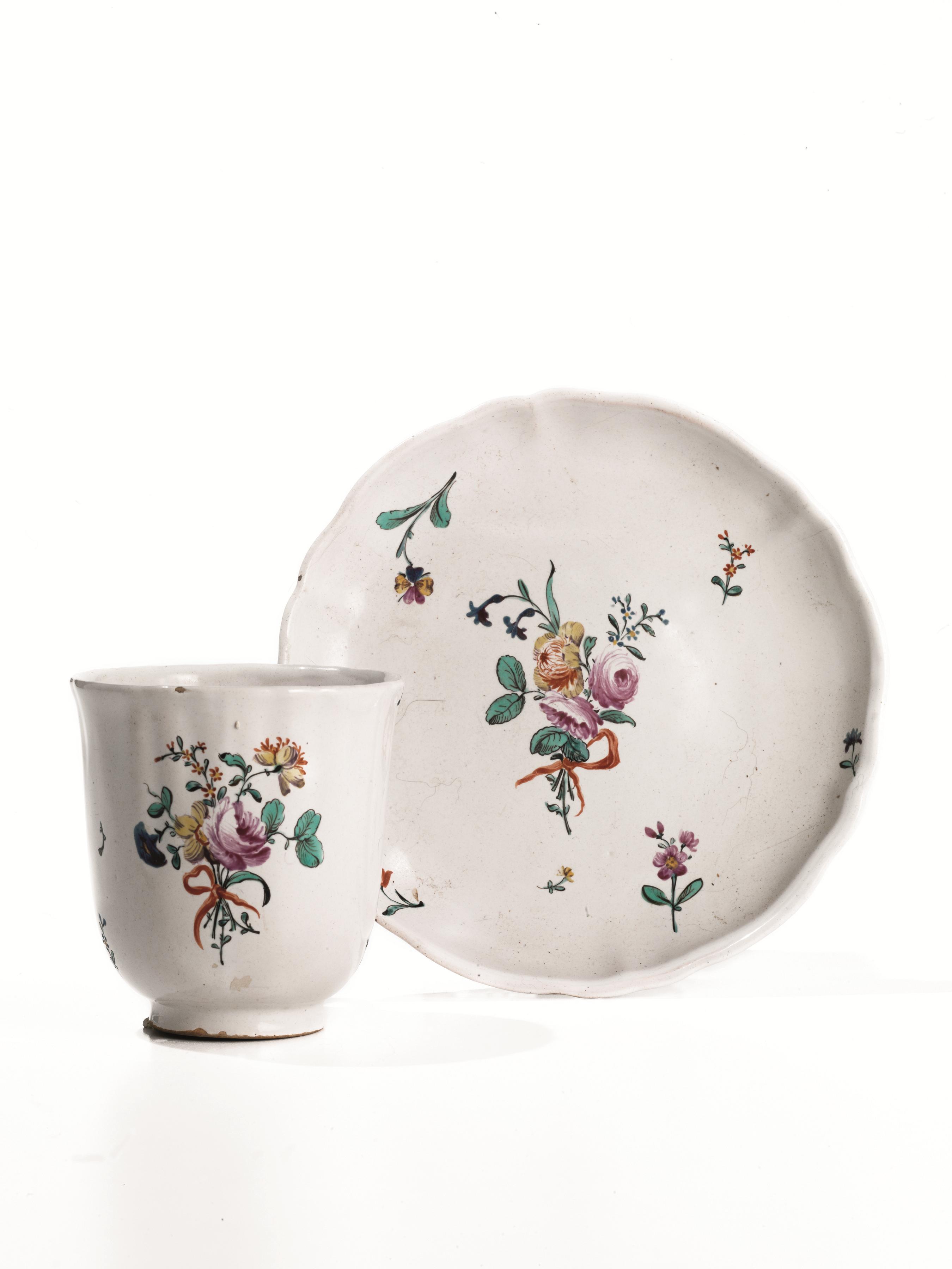 in maiolica decorata a piccolo fuoco in policromia con porpora, verde, giallo, bruno di manganese, tazza alta con ansa a torciglione e piattino con orlo esalobato, dipinti in policromia a piccolo fuoco con raffinati mazzetti di “fiori fini” trattenuti da nastri e rametti sparsi di contorno. Per l’attribuzione si consideri il confronto con due vasetti del Museo Internazionale delle Ceramiche in Faenza (Inv. n. 24227-24228), e con una caffettiera delle Civiche Raccolte d’Arti Applicate del Castello Sforzesco a Milano, tazza alt. cm 7,5, piattino diam. cm 14
