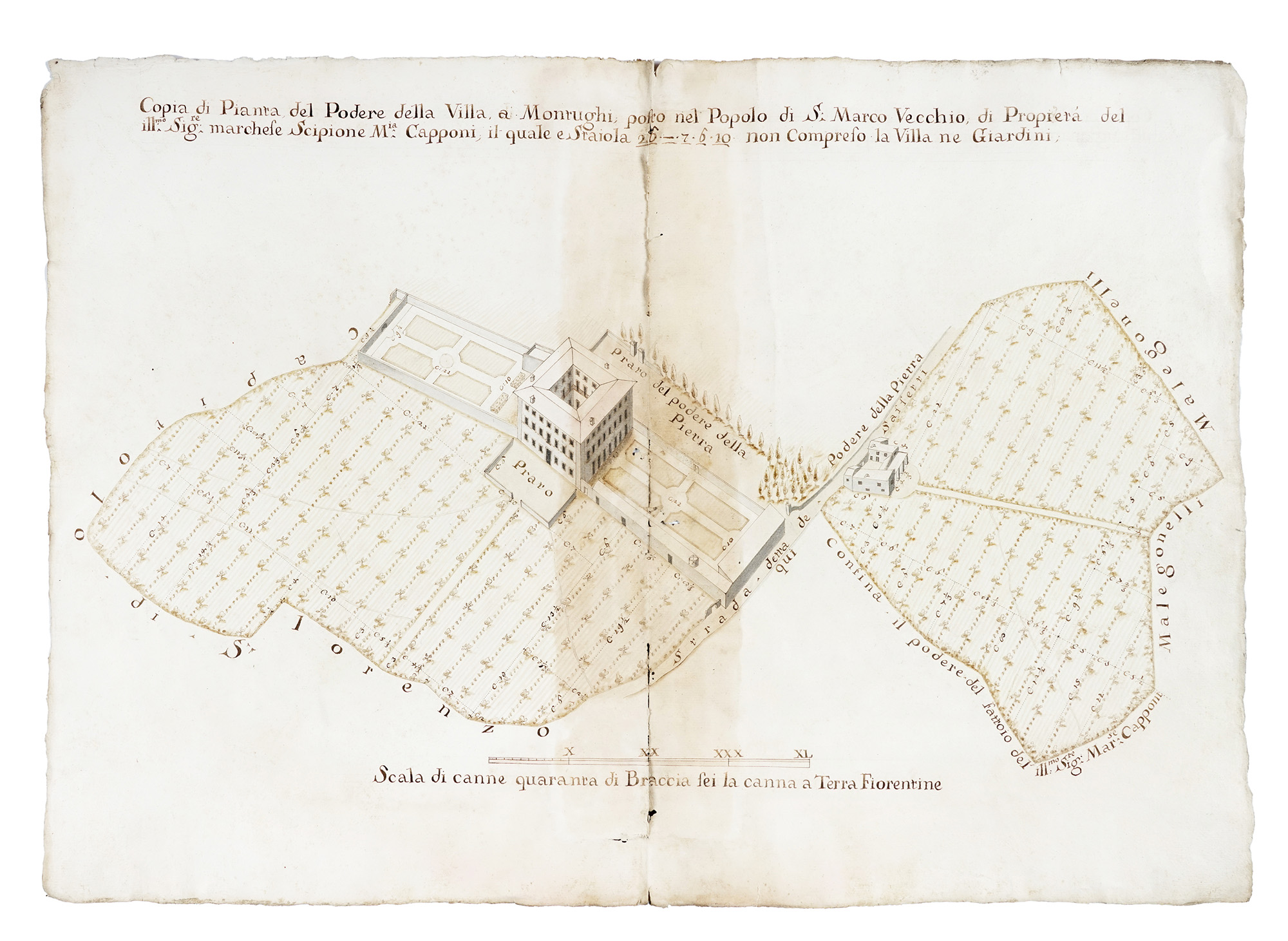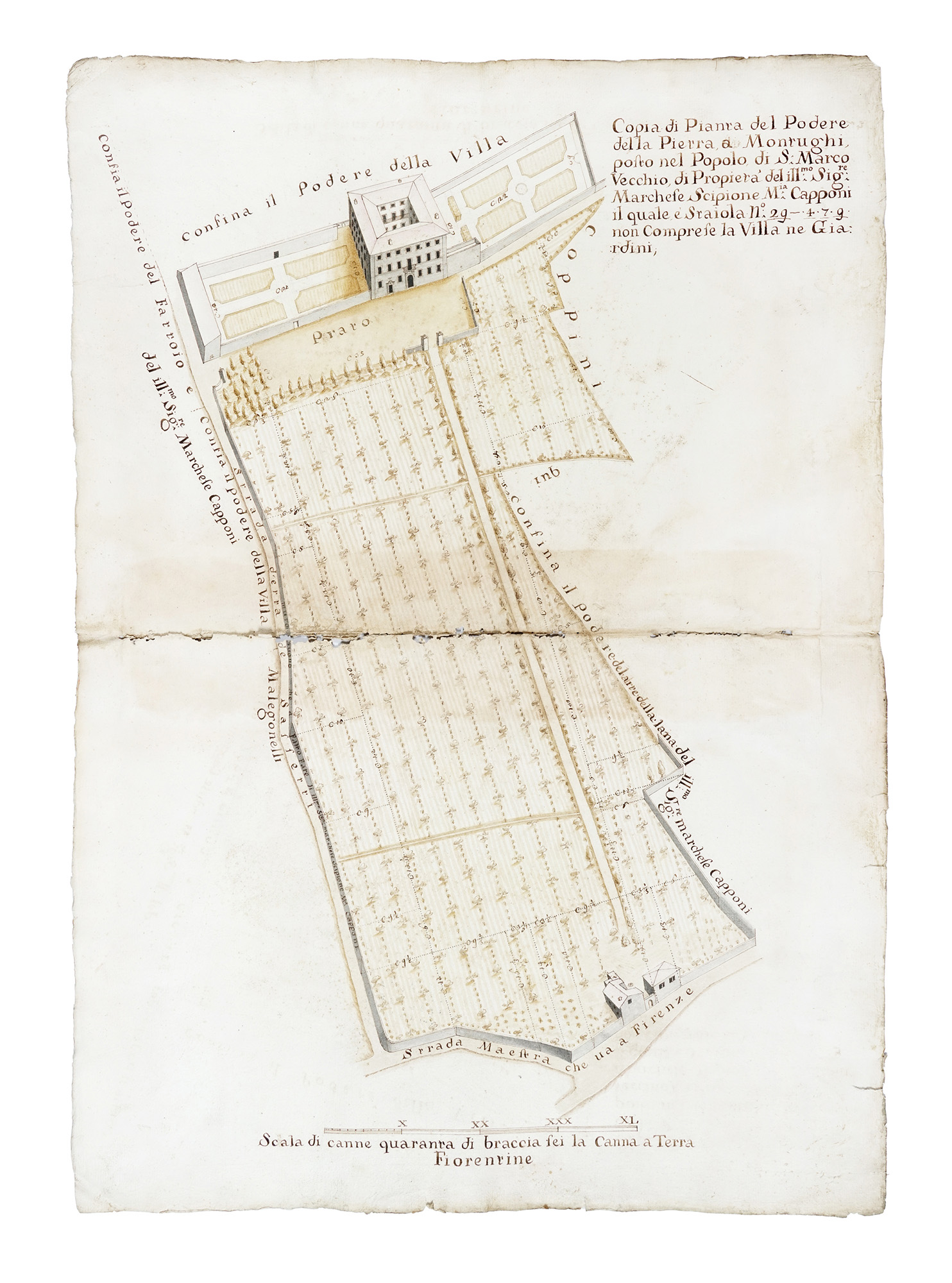 Copia della pianta de quattro uniti poderi, alla villa, del ill:mo Sig:re Marchese Scipione Maria Capponi, posta a montui nel Popolo di S: Marco Vecchio /...podere della Pietra/... podere della Villa/...podere del Fattoio e dell'Arte della lana. 1727-1753.