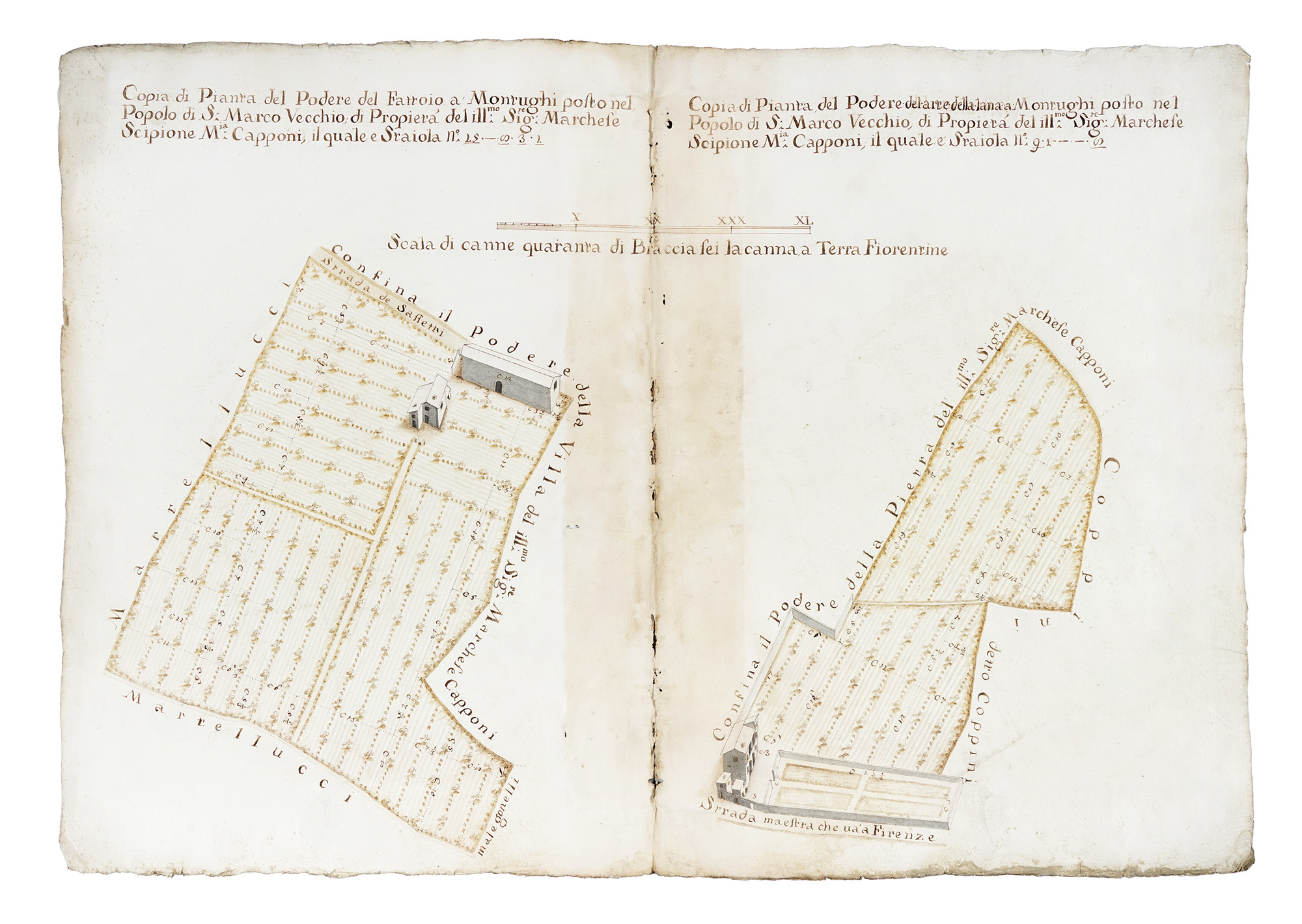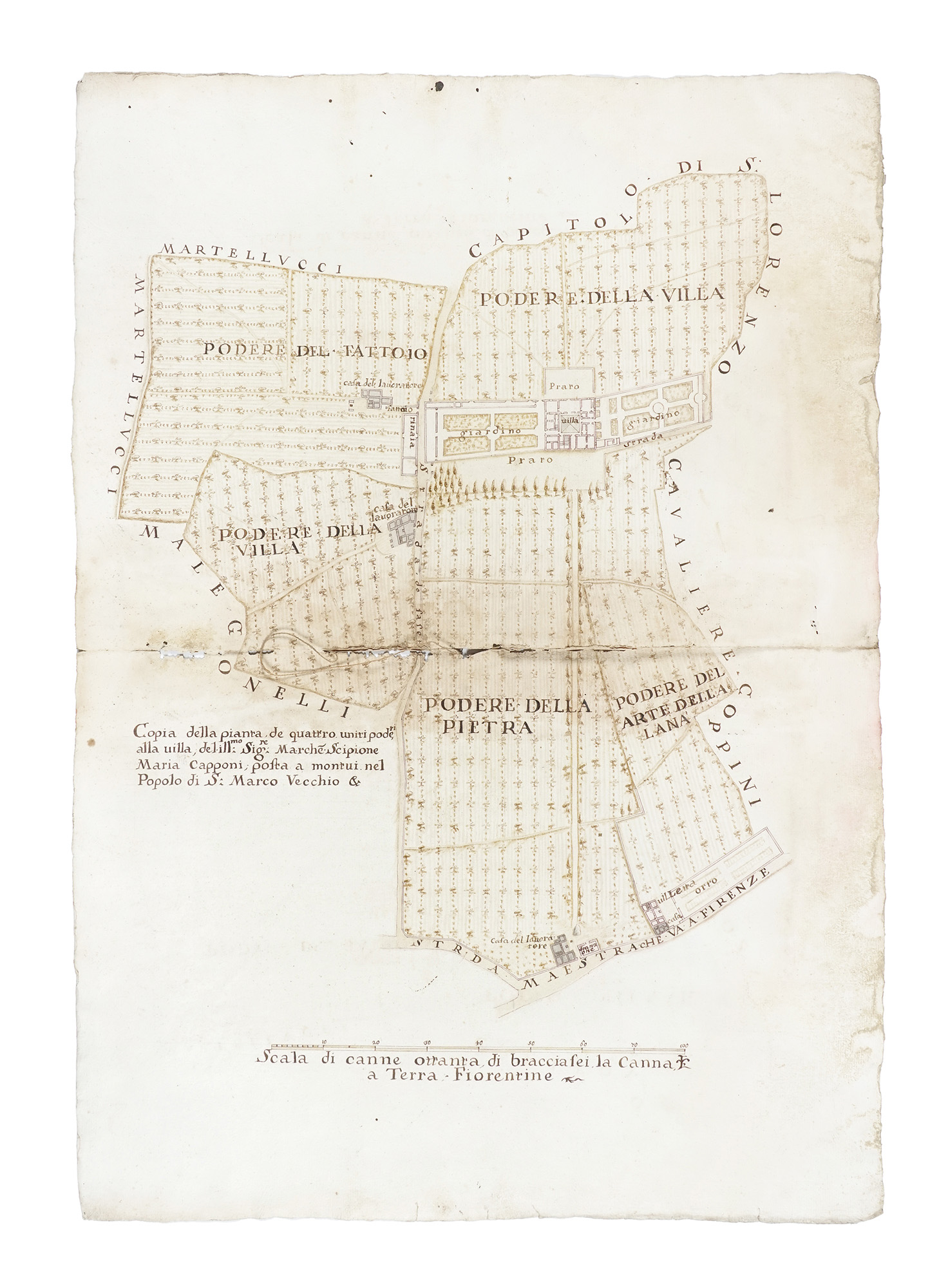 Penna e inchiostro bruno, acquerello a colori, carta vergellata pesante. mm 540x765 ciascun foglio. Il primo dei quattro cabrei mostra l'insieme dei poderi di Villa La Pietra con al centro la pianta della villa e dei giardini. Ciascun appezzamento presenta coltivazioni ordinate e omogenee fatte impiantare, stando a quanto esplicitato nella pianta del Podere del Piano, e per confronto con questa proveniente dallo stesso regesto, dal marchese Scipione Capponi nel 1727. Le "copie" dei quattro poderi di questa raccolta - della Pietra, della Villa, del Fattoio e dell'Arte della lana (questi ultimi su unico foglio) -, con titolo descrittivo su più righe contenente misurazione in staiola, intendono mostrare il loro riordino dopo l'avvio delle nuove piantumazioni e la costruzione di nuovi edifici. Di ogni appezzamento sono riportate le misure per ogni suddivisione, indicati i proprietari confinanti, e la posizione della "Strada maestra che va a Firenze". Scala di canne e di braccia, la Canna a Terra fiorentine. Eccezionale raccolta di cabrei relativi alle pertinenze di uno dei luoghi più iconici delle prime pendici fiorentine. Villa La Pietra deriva il suo nome da quello di una piccola località sulla via Bolognese, così appellata da un'antica pietra miliare romana che indicava il settimo miglio dalla porta nord della città di Firenze. I terreni e gli edifici dove sorge la villa nel 1460 passarono di proprietà dai consoli dell'Arte della Lana al banchiere Francesco Sassetti; i Sassetti alienarono La Pietra a Giuliano di Piero Capponi nel 1546, la cui famiglia tenne la villa fino all'Ottocento. Il cardinale Luigi Capponi in particolare, dopo un soggiorno in Romagna come legato pontificio, tornò a Firenze scegliendo proprio questa villa come residenza. In questa occasione venne aggiunto lo stemma Capponi sopra il portale posteriore, sormontato dal cappello cardinalizio. Il Marchese Alessandro Capponi entrò in possesso della villa nel 1697 e intraprese nuove modifiche, trasformando la villa nella sua forma attuale. Nel periodo di Firenze Capitale la villa fu sede dell'Ambasciata di Prussia. Nel 1814 Gino Capponi vi ospitò Ferdinando III di Toscana, prima che si reinsediasse a Firenze dopo la Restaurazione, come ricorda la lapide sulla facciata. Alla morte dello statista la villa passò in via ereditaria ai suoi nipoti della famiglia Incontri, il cui stemma coi due leoni e banda trasversale è visibile sia sulla seconda cancellata, davanti alla villa, sia sulla facciata posteriore. All'inizio del XX secolo la proprietà fu comprata da Arthur e Hortence Acton. Ereditata dal figlio Harold Acton, la villa fu un rilevante centro culturale, e vi venne collocata la straordinaria collezione del suo proprietario. Alla morte di Acton la villa venne trasmessa in eredità alla New York University. (4) Fogli integri con margini intonsi. Piega di legatura in verticale al centro, aperta per largo tratto talvolta con piccole mancanze, residuo di brachetta al verso. Lieve ingiallimento, traccia di aloni e di vecchia polvere.