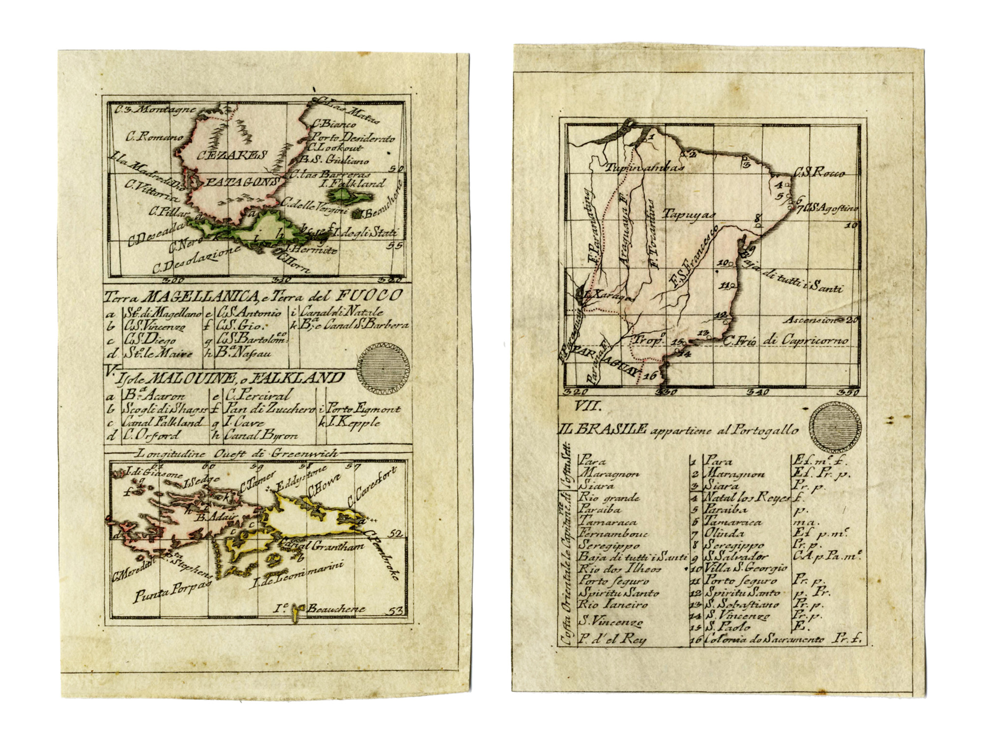 Incisione in rame in coloritura originale coeva. mm 117x74. Al centro della mappa in alto la grande terra dei Patagoni, con l'indicazione di Capo Horn, fiancheggiata dalle Isole Falkland e dall'arcipelago Madre de Dios. Numerosi promontori censiti e nominati. In basso l'arcipelago delle Falkland formato da due isole maggiori e da circa 200 isole minori, tra cui l'isola dei Leoni Marini. / Il Brasile. Incisione in rame in coloritura originale coeva. mm 117x75. Mappa della costa atlantica del Brasile con 16 rimandi di toponimi esplicitati nella legenda sottostante. Segnata la baia di Ognissanti (baía de Todos os Santos in portoghese), una rientranza del litorale brasiliano nello Stato di Bahia e la minuscola isola di Ascension (2)