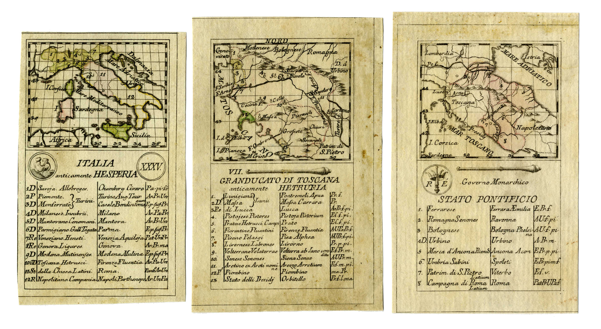 Incisione in rame in coloritura originale coeva. mm 105x65. Mappa della penisola intera con legenda sottostante a 12 rimandi ai territori. / Granducato di Toscana. Incisione in rame in coloritura originale coeva. mm 114x74. Mappa della regione con ricca indicazione di toponimi, in evidenza anche fiumi e laghi oltre a legenda a 12 rimandi. / Stato pontificio. Incisione in rame in coloritura originale coeva. mm 117x73. Mappa che comprende tutta l'Italia centrale dal Mar Toscano all'Adriatico, dalla Romagna al Lazio. (3)