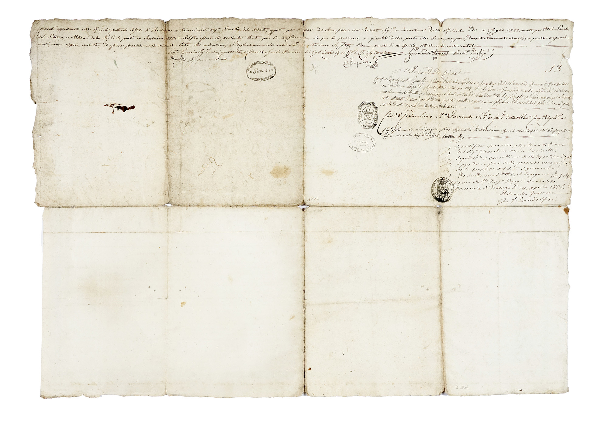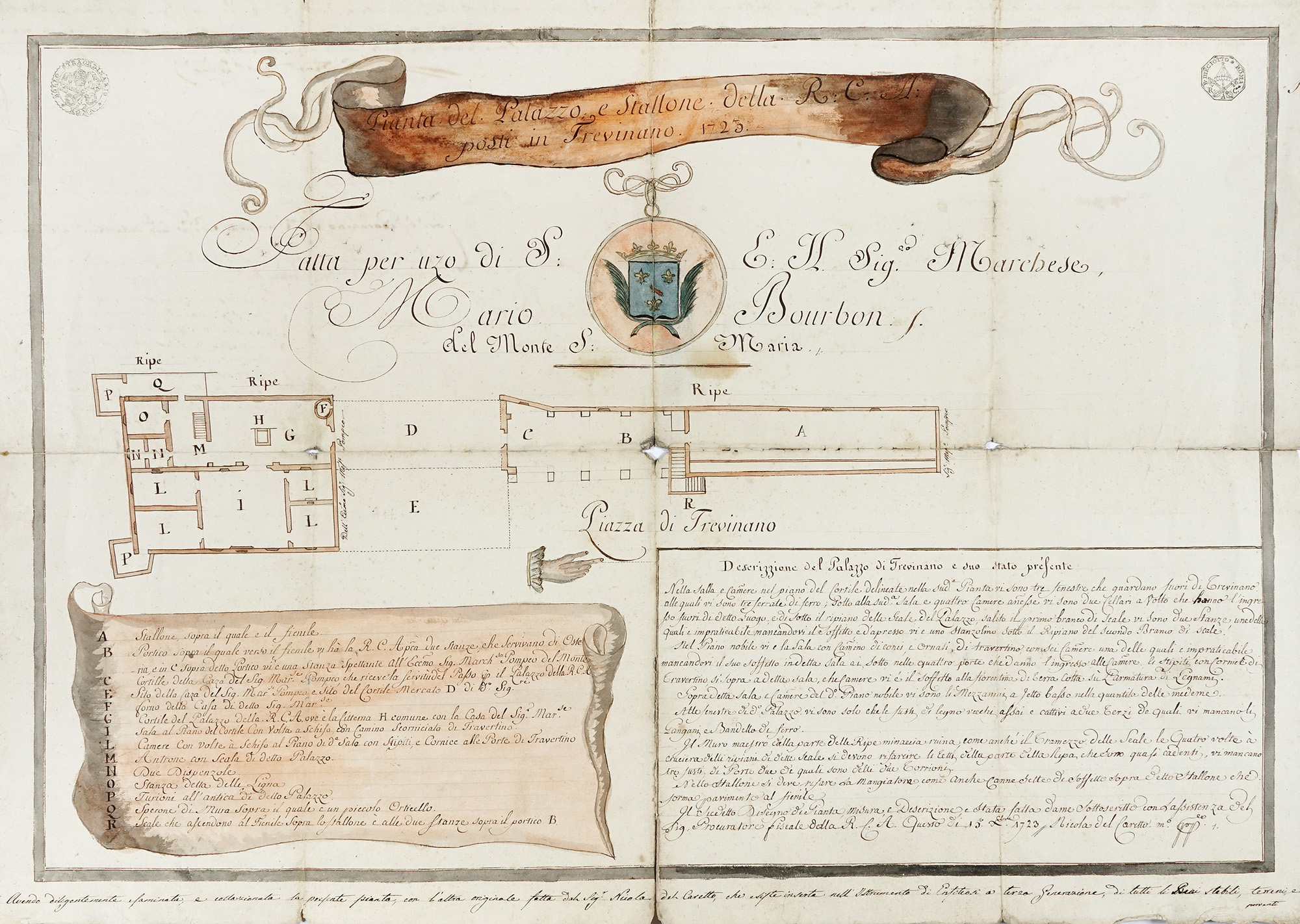 Penna e inchiostro bruno, acquerello a colori, carta vergellata pesante. mm 570x815. La parte superiore della tavola è occupata dal titolo entro grande cartiglio a nastro, segue scrittura esplicativa con al centro il blasone della famiglia Bourbon del Monte con i gigli di Francia. Al centro la pianta del castello con a sinistra il corpo centrale dai torrioni angolari, dove la divisione degli ambienti è contraddistinta da lettere da A a R sciolte nella legenda sottostante, e i lati lungo le parti scoscese indicati con "ripe". Procedendo verso destra si incontrano la casa del Marchese Pompeo con il cortile e il portico e infine, nella parte finale, la pianta del grande Stallone, con affaccio sulla Piazza di Trevinano. Nella parte in basso a destra si legge la Descrizione del Palazzo di Trevinano e suo stato presente, con la dichiarazione finale sottoscritta e la data "[...] detto Disegno di Pianta, misura e Descrizione, è stata fatta da me sottoscritto con l'assistenza del Sig. Procuratore fiscale della R.C.A. Questo di 15.X.1723 Nicola Del Caretto m.o prop.a". Nel 1187, a seguito di un trattato di pace tra le città di Acquapendente e Orvieto, l'abitato di Trevinano venne concesso ai figli di Sinibaldo Visconti di Cambiglia. I Visconti di Campiglia restarono a Trevinano fino al 1327, poi i Monaldeschi del ramo della Cervara subentrarono dal 1327 al 1592; in seguito Trevinano fu diviso dalla Reverenda Camera Apostolica, tra la famiglia Simoncelli e gli eredi dei Monaldeschi. Nel 1687 la Camera Apostolica entrò in possesso di tutto il territorio riunificato e lo cedette in feudo ai Bourbon del Monte. Dopo essere stato circa 300 anni possedimento della famiglia Bourbon del Monte, il castello è diventato proprietà dei Boncompagni-Ludovisi. Il castello, che ancora reca sul portale lo stemma dei Monaldeschi della Cervara, è attualmente proprietà del Principe Paolo Francesco Boncompagni-Ludovisi. In basso al recto con prosecuzione al verso, nota manoscritta datata 18 aprile 1826, di Gioacchino Maria Farinetti, Segretario Cancelliere della Reverenda Camera Apostolica, in cui si attesta la corrispondenza esatta della pianta presente a quella depositata presso la Reverenda Camera Apostolica. Con timbri della Reverenda Camera Apostolica. (1) Foglio integro con margini intonsi. Traccia di piegatura del foglio in più parti con alcune pieghe aperte alle estremità e piccole lacune nei punti di intersezione. Alcune parti con ritocchi posteriori all'acquerello. Minimi brevi strappi localizzati alle estremità, segni d'uso.