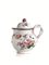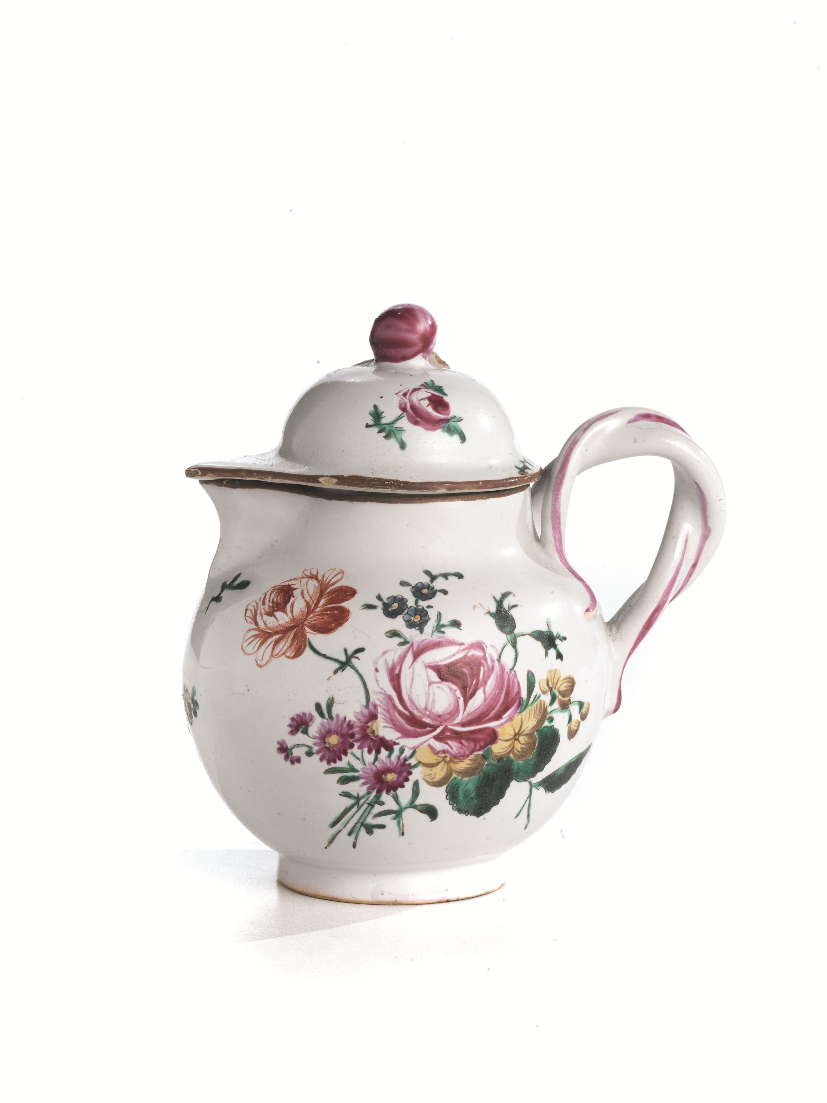in maiolica decorata a piccolo fuoco in policromia con porpora, verde, giallo, bruno di manganese, ansa a torciglione e coperchio con terminale a frutto, dipinto con mazzetti floreali alla “rosa” su entrambi i lati dell’invaso e rametti sparsi di contorno. Sotto la base sigla “F.” tracciata in azzurro, alt. cm 11,5