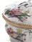 in maiolica decorata a piccolo fuoco in policromia con rosso, porpora, verde, giallo, bruno di manganese, corpo modellato secondo la consueta morfologia del repertorio bolognese e decorata a piccolo fuoco e dorature con un motivo di ispirazione orientale ugualmente esclusivo di tale produzione. Si tratta di uno dei modelli ornamentali più costosi e che le carte d’inventario del 1796 descrivono con oro e contorno giallo: l’immagine idealizzata del mondo orientale è rappresentata da un edificio a pagoda sullo sfondo e dalla grande peonia in primo piano, da cui si origina un esile alberello a due ramificazioni su cui poggia un variopinto uccellino col capo all’indietro. La bordura in giallo che delimita i bordi di corpo e coperchio sfrutta gli stessi elementi a “punta di lancia” delle porcellane cinesi importate dalla Compagnia delle Indie. Dei pezzi noti di questa tipologia la zuppiera rappresenta un unicum. Alla base dalla sigla “F.” tracciata in azzurro, cm 22,5x31,5x23.