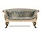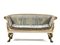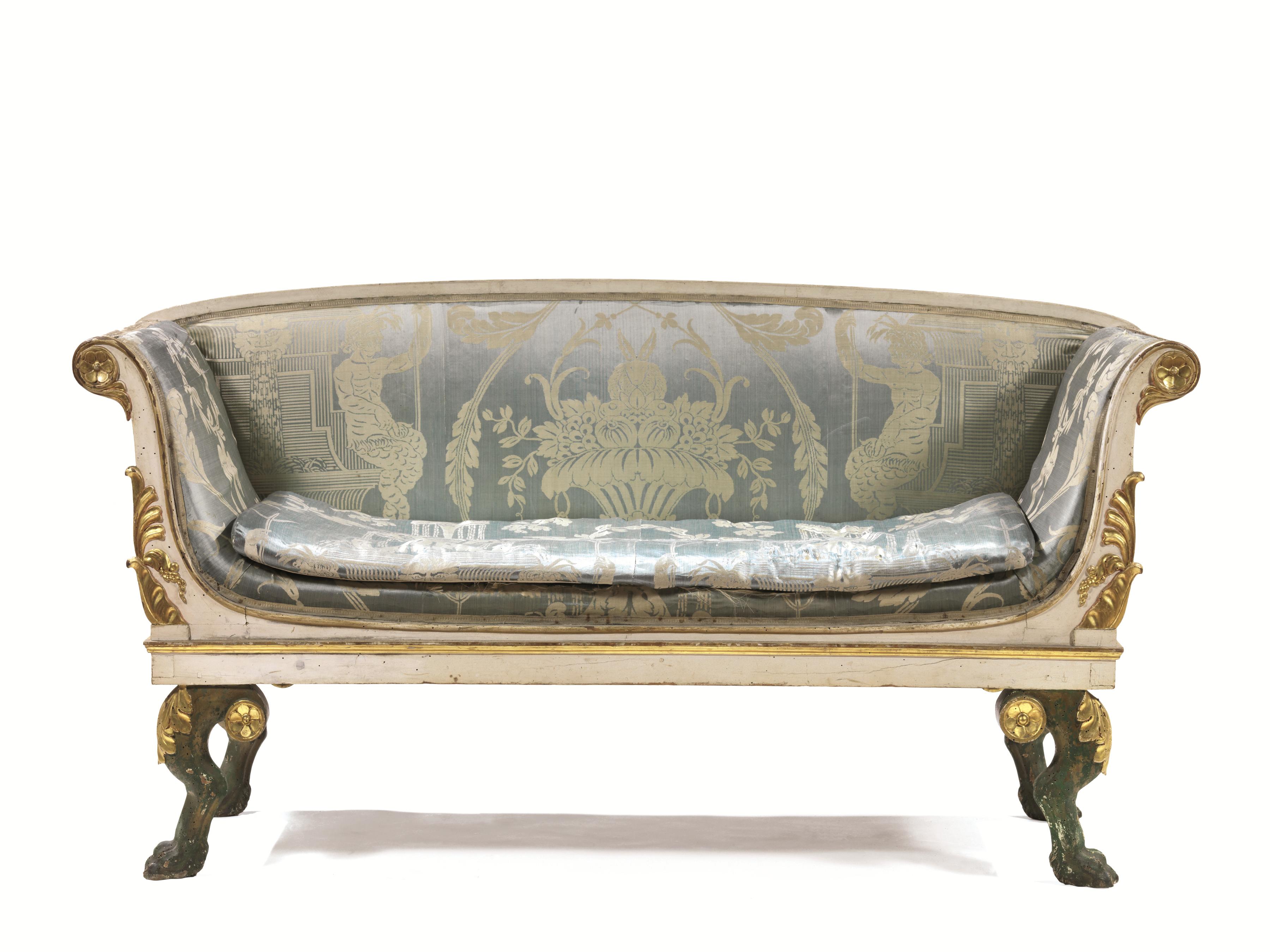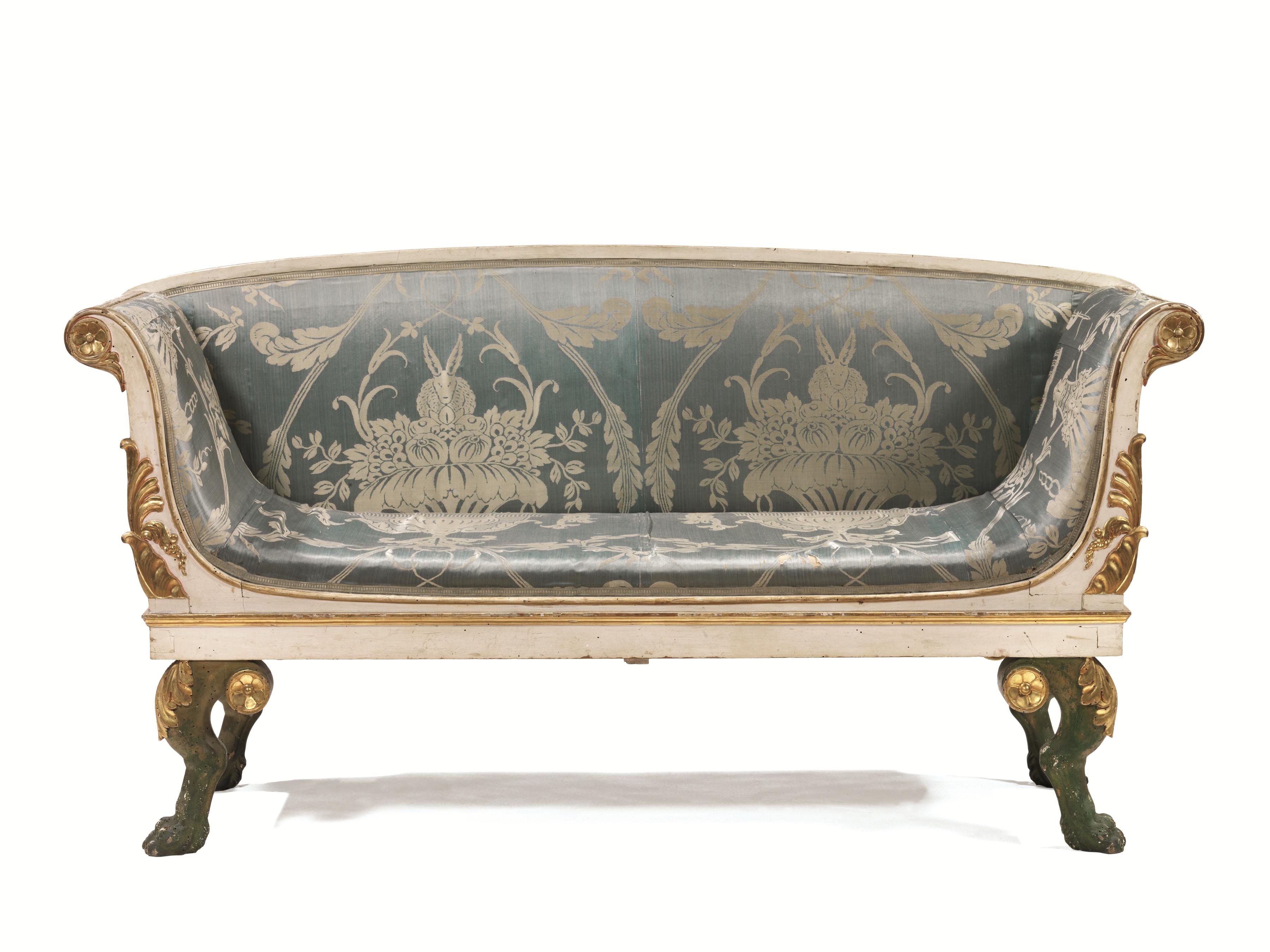 in legno dipinto bianco e oro e intagliato, braccioli a lira stilizzata modellati come fasci riuniti da nastri e sorretti da grandi foglie di acanto dorate, piedi configurati a zampa leonina con rosette all'acanto, ricoperti in damasco di seta celeste, lungh. cm 167, cadute di colore e danni alla stoffa (2)