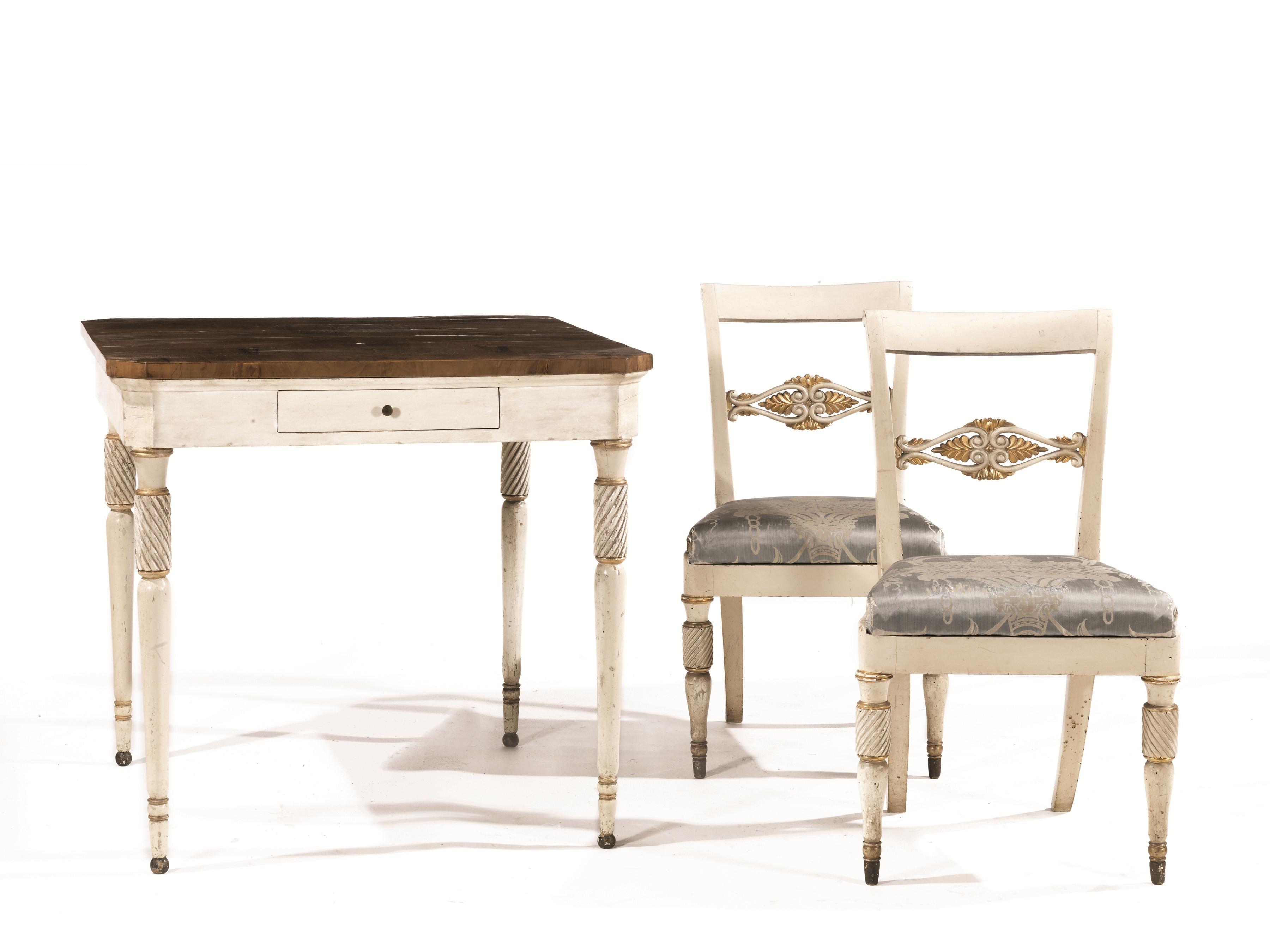 Tavolo da centro, en suite con il lotto precedente, piano quadrato con angoli scantonati in noce a patina bionda, gambe a tortiglione, un cassetto nella fascia, cm 86x86x81, riprese alla pittura, e quattro sedie con spalliera svasata, cartella a volute e palmette contrapposte, gambe anteriori a tortiglione e posteriori a sciabola, ricoperte con damasco di seta celeste, riprese alla doratura e danni alla stoffa (5)