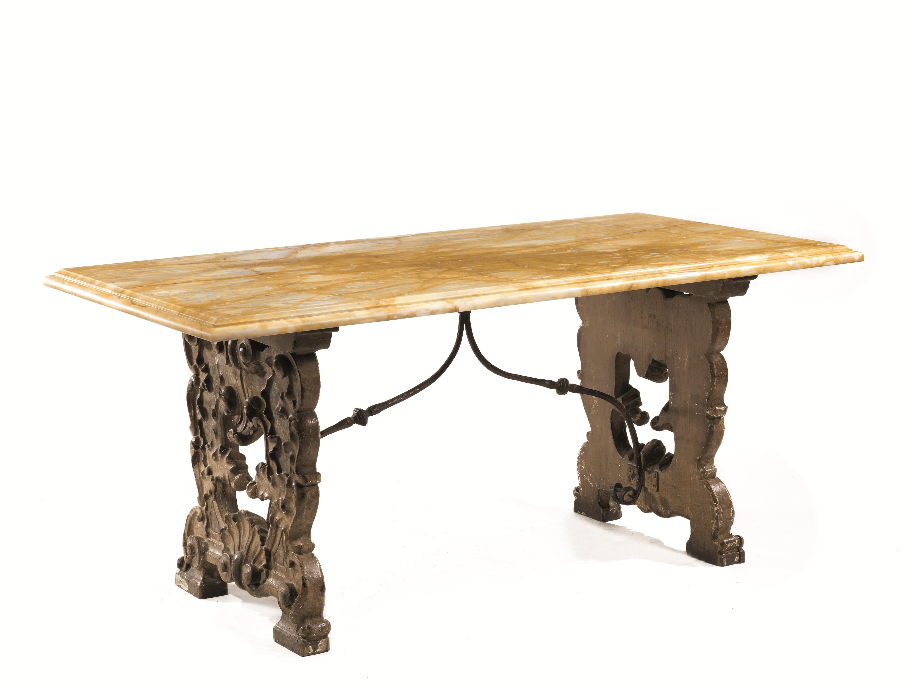 Tavolo, Spagna, prima metà sec. XVIII, con gambe a lira in legno intagliato e dipinto a volute di foglie di acanto contrapposte centrate da conchiglie, riunite da sproni in ferro battuto, piano rettangolare di epoca posteriore in marmo giallo di Siena con becco di civetta, cm 180x92x80