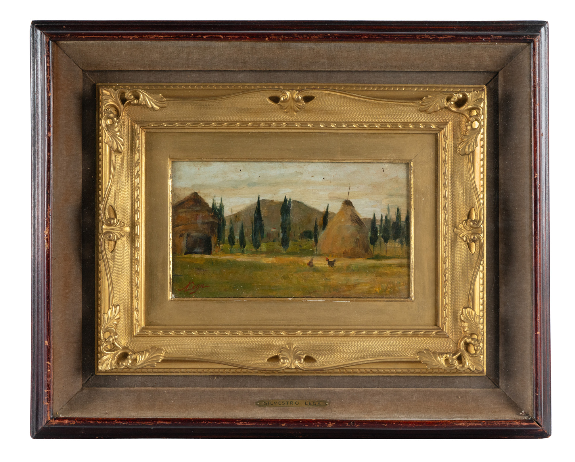 Olio su tavola. cm 14x24. Firmato in basso a destra. Appunti di collezione al verso. Di questo stesso soggetto è presente un secondo quadro intitolato Paese, dove però la composizione è invertita tra la struttura ed il pagliaio. Etichetta d'artista applicata in basso al centro. (1) In bella cornice con vetro: cm 42,5x53. Tracce d'uso lungo i margini. Buona conservazione generale.