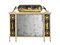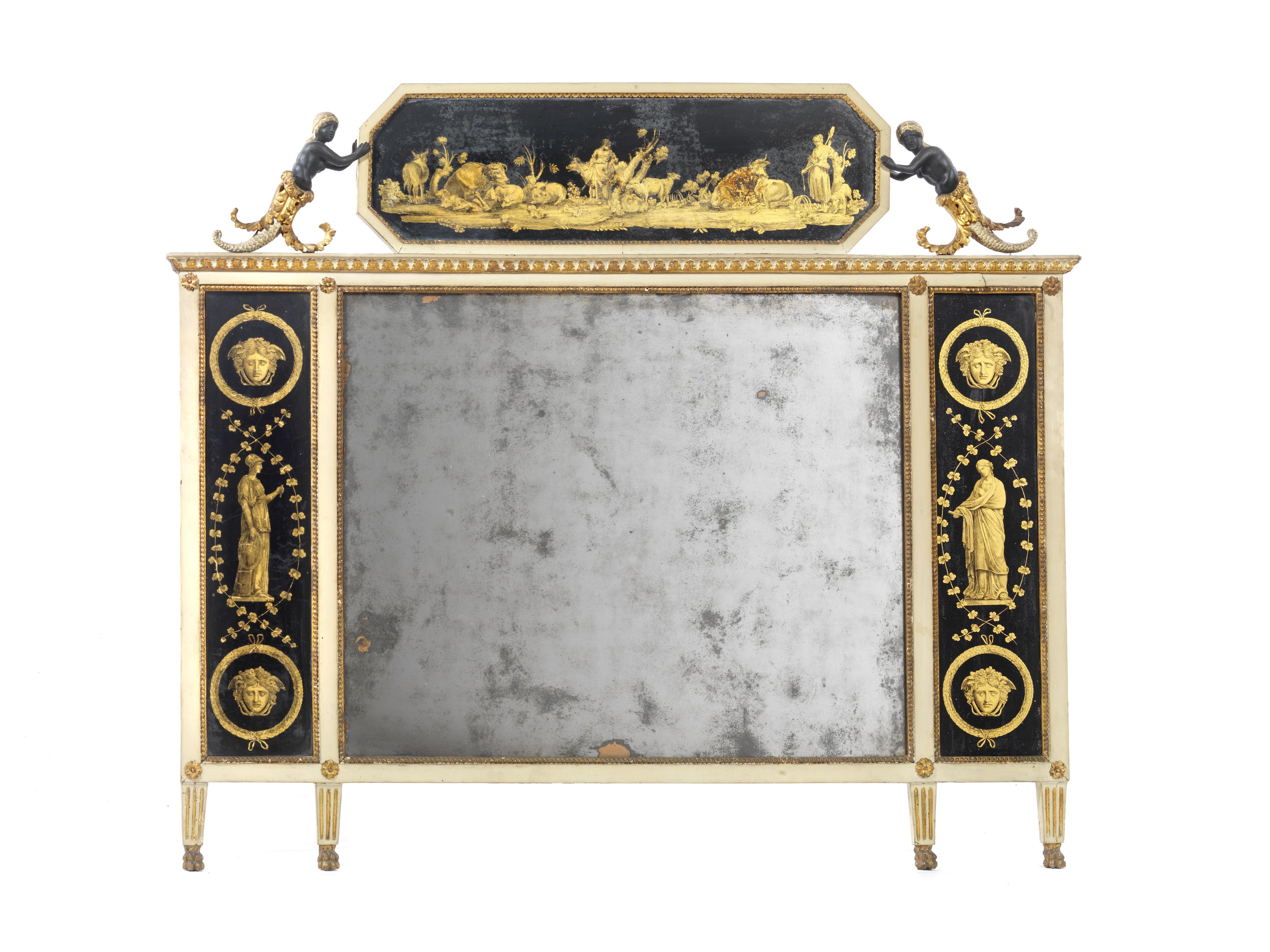 in legno laccato bianco, intagliato e in parte dorato, cimasa ottagonale con scena pastorale dipinta in oro su vetro, sostenuta da due sirene, specchio a tre scomparti di cui i due laterali decorati in oro su vetro con figure classiche e teste dimedusa entro ghirlande, piedi scannellati su zampe leonine, cm 151x126, piccoli danni e mancanze